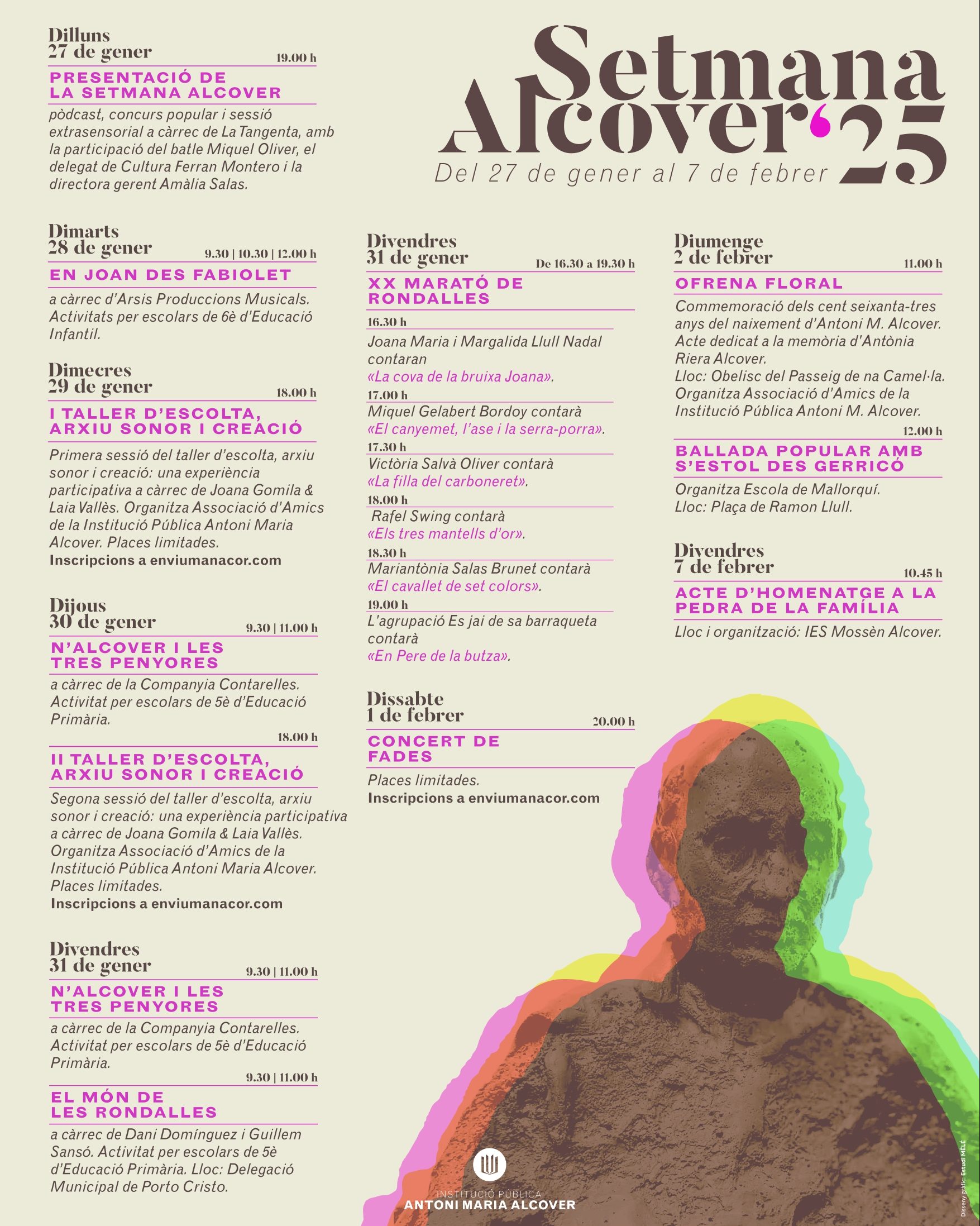 Se li ha donat molta importància al concert de Fades, que tendrà lloc dissabte 1 de febrer, però jo crec que el plat fort de la Setmana Alcover no és el concert, ni el podcast, sinó la Marató de Rondalles. Enguany el que hem fet és convidar a persones de diferents àmbits artístics: músics, actors o contadors tradicionals, perquè li donin el seu caràcter a les rondalles. Per exemple, hem demanat a Rafel Swing que ens faci una rondalla en rap, en Miquel Gelabert i na Mariantònia Salas que són actors ho faran més dramatitzat, també hi ha una mica de performance, i Victoria Salvà, que és mestra, conta rondalles tradicionals. S’ha intentat recuperar l’oralitat de les rondalles però en diferents àmbits artístics.