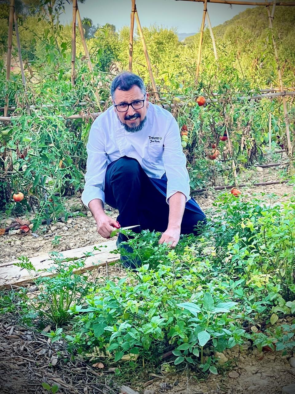 Jose Cortés, a l’hort, seleccionant unes plantes aromàtiques per a les seves creacions.