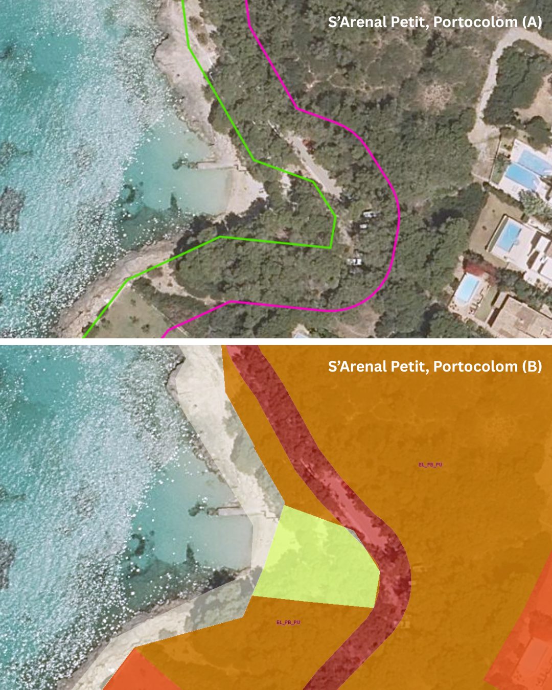 Imatges de la zona mostren les grans dimensions de la plataforma construïda damunt el litoral rocós, així com l’ocupació total de l’espai protegit. A més, els mapes de delimitació del domini públic marítim-terrestre i de la servitud de trànsit evidencien que la instal·lació se situa dins una àrea on aquest tipus d’usos estan expressament prohibits. D’altra banda, segons el Mapa Urbanístic de les Illes Balears (MUIB), la zona està catalogada com a parc urbà (“EL_PB_PU”), una qualificació que no permet activitats comercials, fet que fa l’ús actual incompatible amb el planejament vigent.