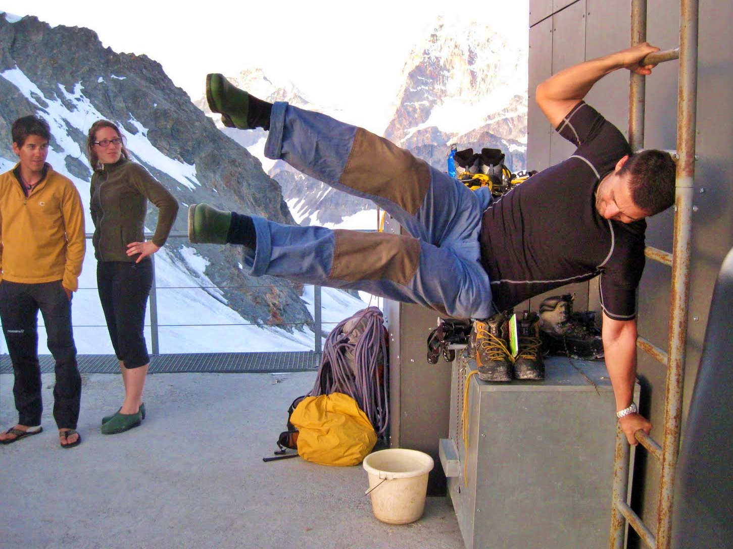 Comencen a arribar alguns curiosos, alertats pel que estava succeint. Encarat a l’escala metàl·lica, fa una sèrie d’inspiracions profundes i, amb una tranquil·litat aparent, s’enganxa als barrerons. Durant els següents catorze segons manté el cos recte i paral·lel al terra. El so del vent fred, bufant sobre aquell penyal inaccessible, esdevé la banda sonora d’aquella proesa física.