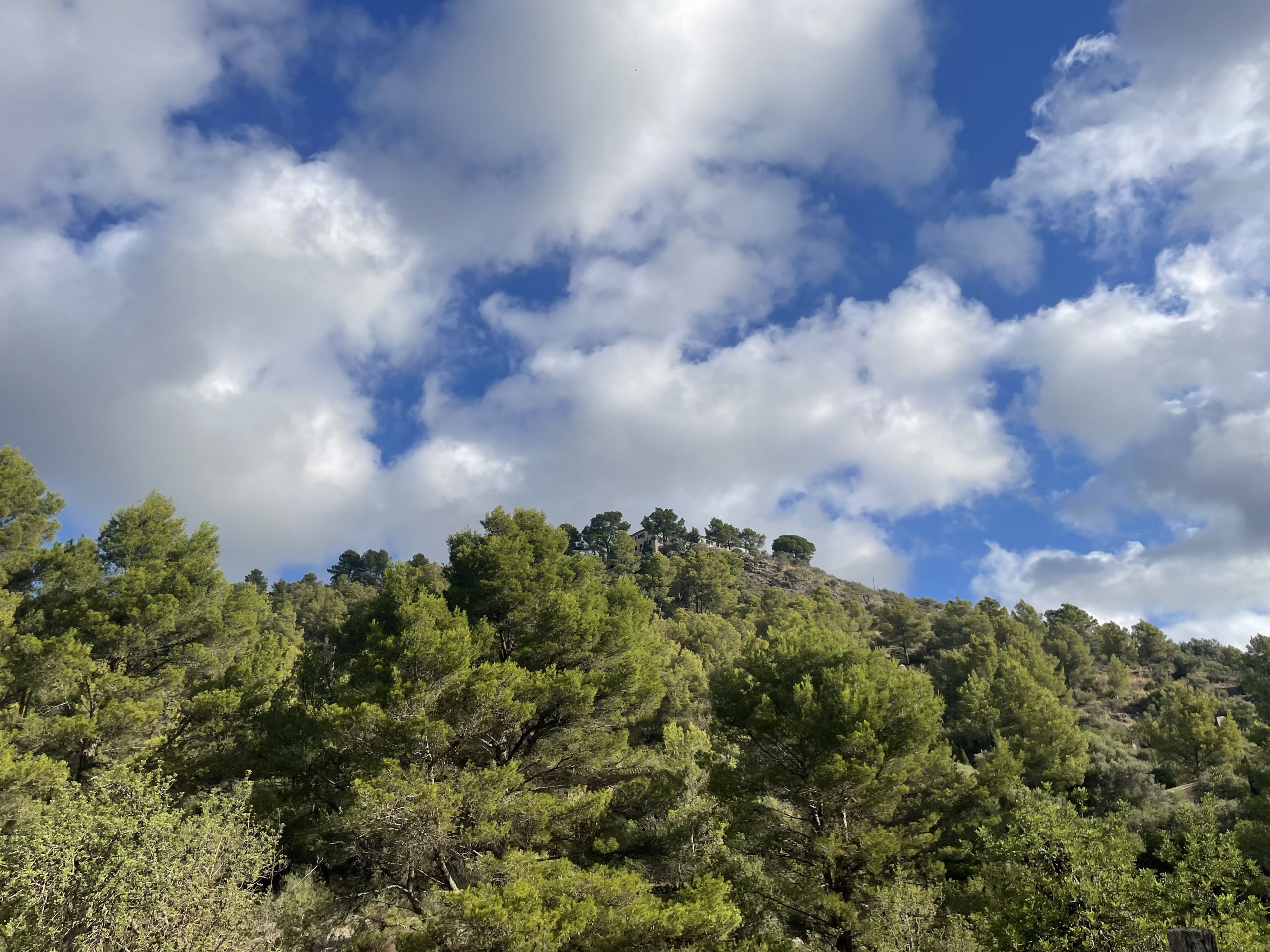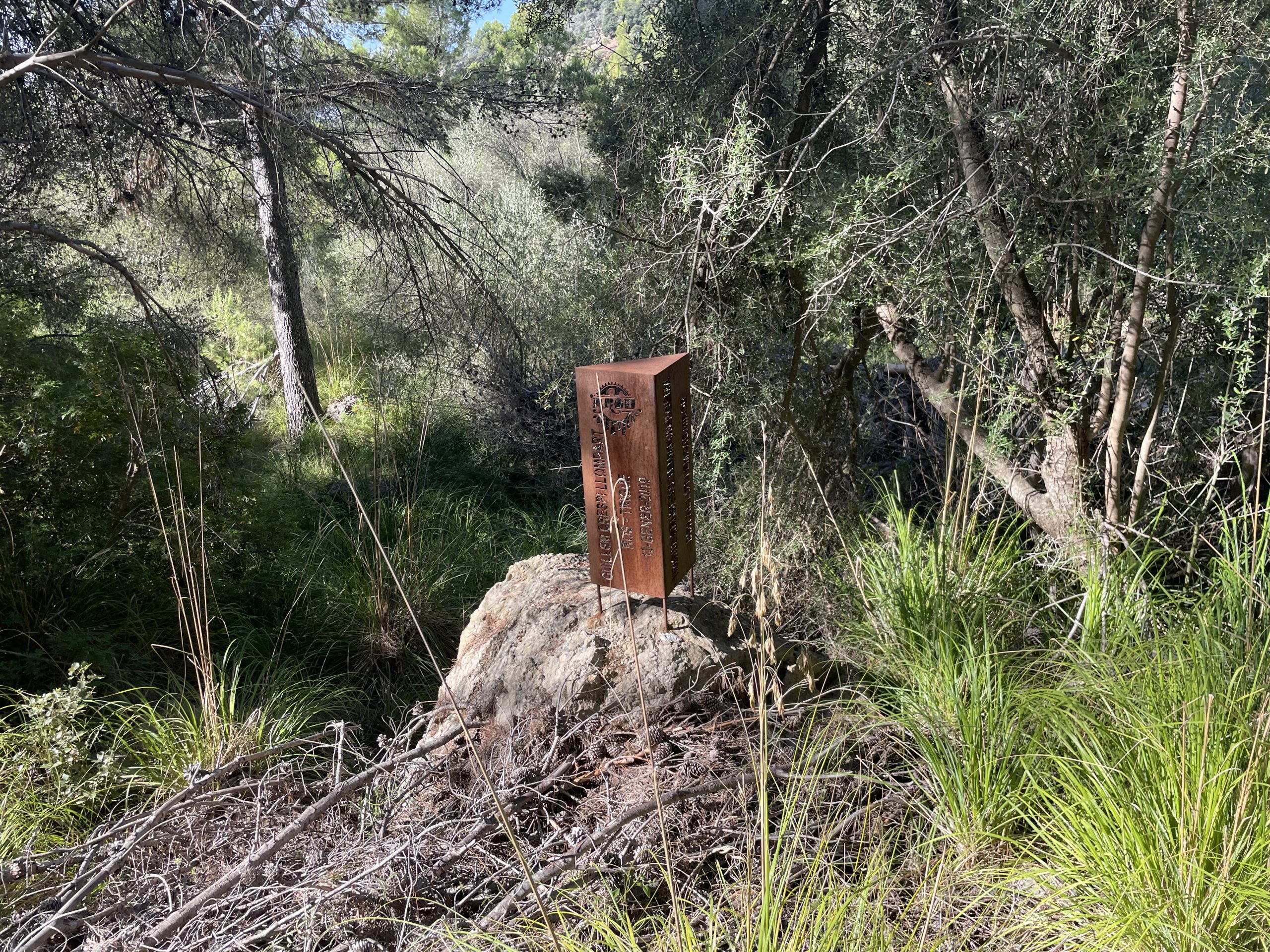 De mica en mica, el sender comença a girar cap a llevant i guanya alçada amb una pujada constant. De tant en tant, el bosc s’obre i regala vistes inesperades, clares com una finestra de llum entre la verdor. En un d’aquests clarobscurs destaca un petit monument metàl·lic: un prisma triangular que recorda un trist succés. Allà, el 13 de gener de 2019, un ciclista va patir un accident que li provocà greus ferides i, finalment, la mort. El seu nom ocupa una de les cares del record deixat pels amics, amb una inscripció que ressona com una abraçada. Que al cel ens veiem tots!