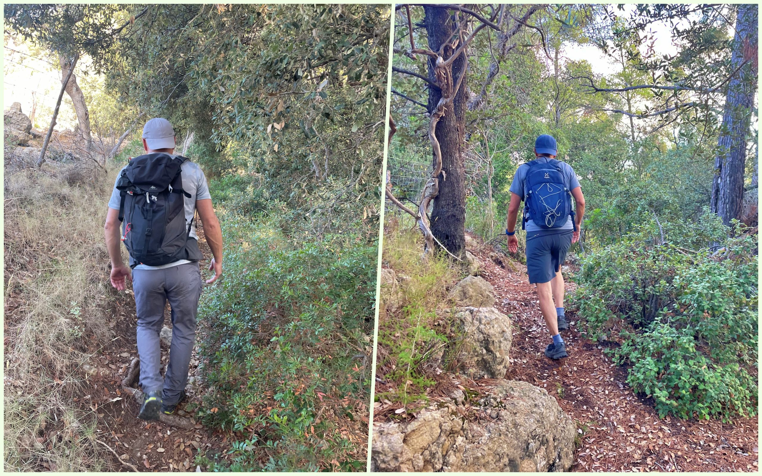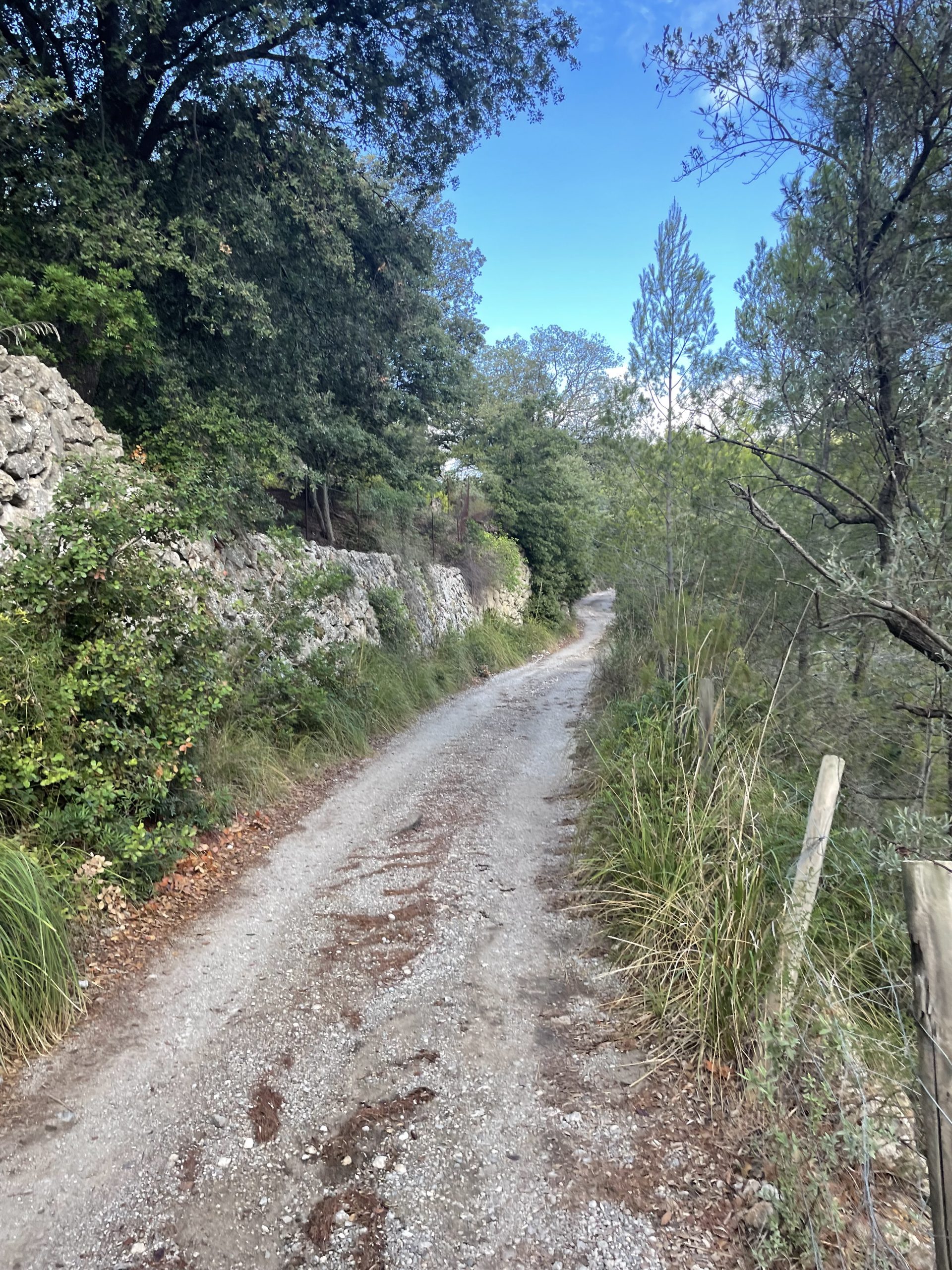 La baixada enllaça trams de camí empedrat amb tiranys que serpentegen damunt les marjades plenes d’oliveres. El cruixit de les fulles i el refrec de les pedres sota les botes acompanyen la marxa. Convindrà recordar que la part superior del trajecte s’asseu sobre la gran esllavissada de 1721. El terreny, irregular i ple de contrastos, revela l’esforç titànic dels qui, amb paciència i braços, aixecaren marges, anivellaren feixes i esporgaren pedres per recuperar els camps de conreu. I després encara hi ha qui es pregunta per què l’oli d’oliva és tan car!