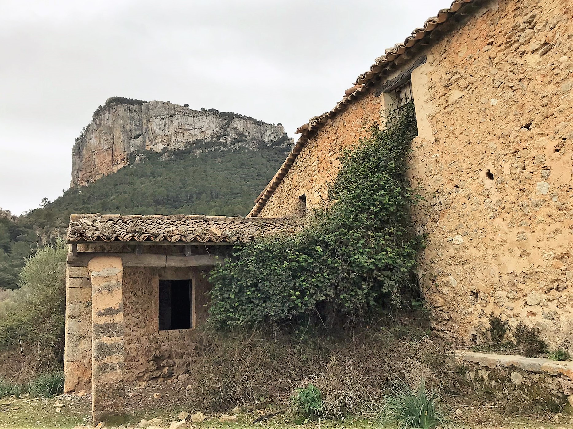 Aviat començarem a veure uns camps reconvertits al cultiu de la vinya amb unes amples estances edificades a l’esquerra. Ens endinsem en la vall que separa els penyalars espadats i vertiginosos del Castell d’Alaró i el seu bessó S’Alcadena, a Ponent i Llevant respectivament. El torrent de Solleric s’atraca amagat sota una cinta d’alzines fins que tenim ocasió de superar una barrera pel portell que s’obre en el costat dret.