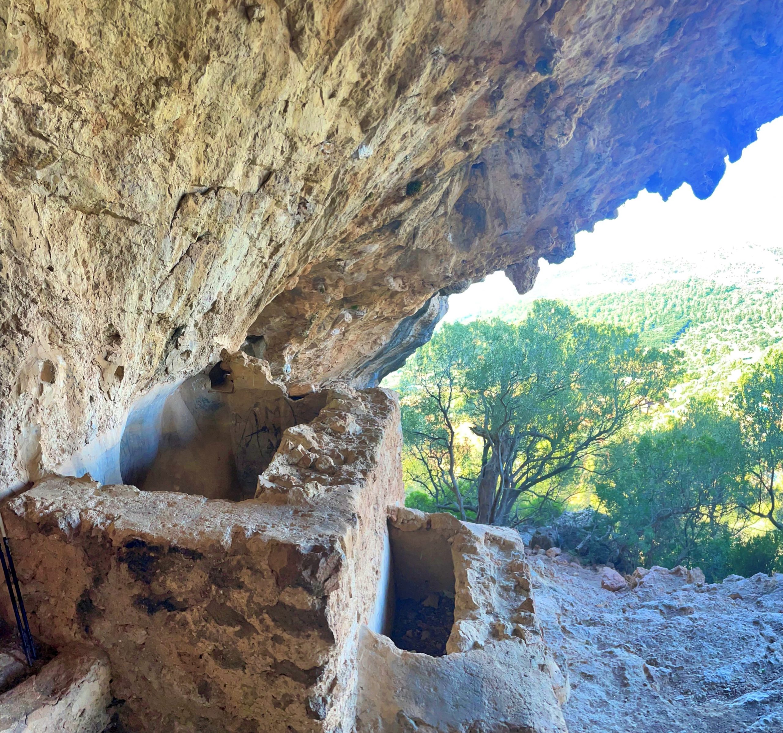 En l’aproximació, advertirem una paret que barra el pas a la cavitat, amb una petita obertura a la dreta. Cap a ella ens dirigirem per entrar a la cambra principal. Just en travessar l’entrada, veurem a la dreta una estructura que recorda una cisterna per recollir aigua. Si avancem cap a la part més elevada, n’observarem una altra: en aquest cas, la seva funció és clara, com ho demostra l’abeurador situat al davant. Un dipòsit recollia l’aigua que regalimava de les parets per abastir els animals.