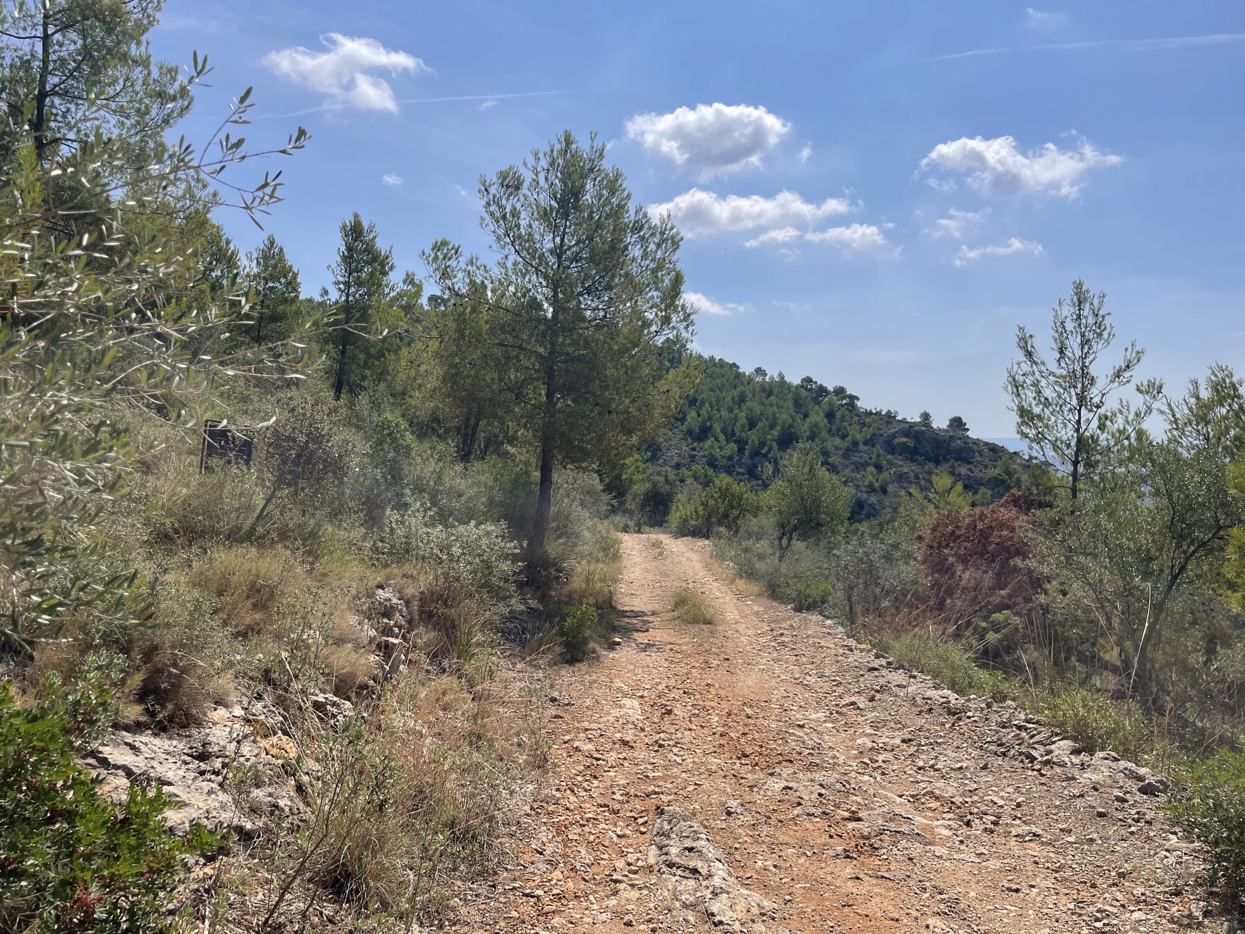 Desfem el camí fins a retrobar la ruta principal, i prenem la pista —recentment netejada— que perd alçada amb decisió. Aviat arribem a un tram on esdevé un tirany, que serpenteja entre el càrritx i a l’ombra dels pins, tot esquivant antics forns de calç i alguna que altra sitja. Som al bell mig del Comellar de Sa Cuina, amb el Penyal de Ses Abelles flanquejant-nos per la dreta. Aviat el camí torna a definir-se i ens facilita l’arribada a les cases de Can Sec.