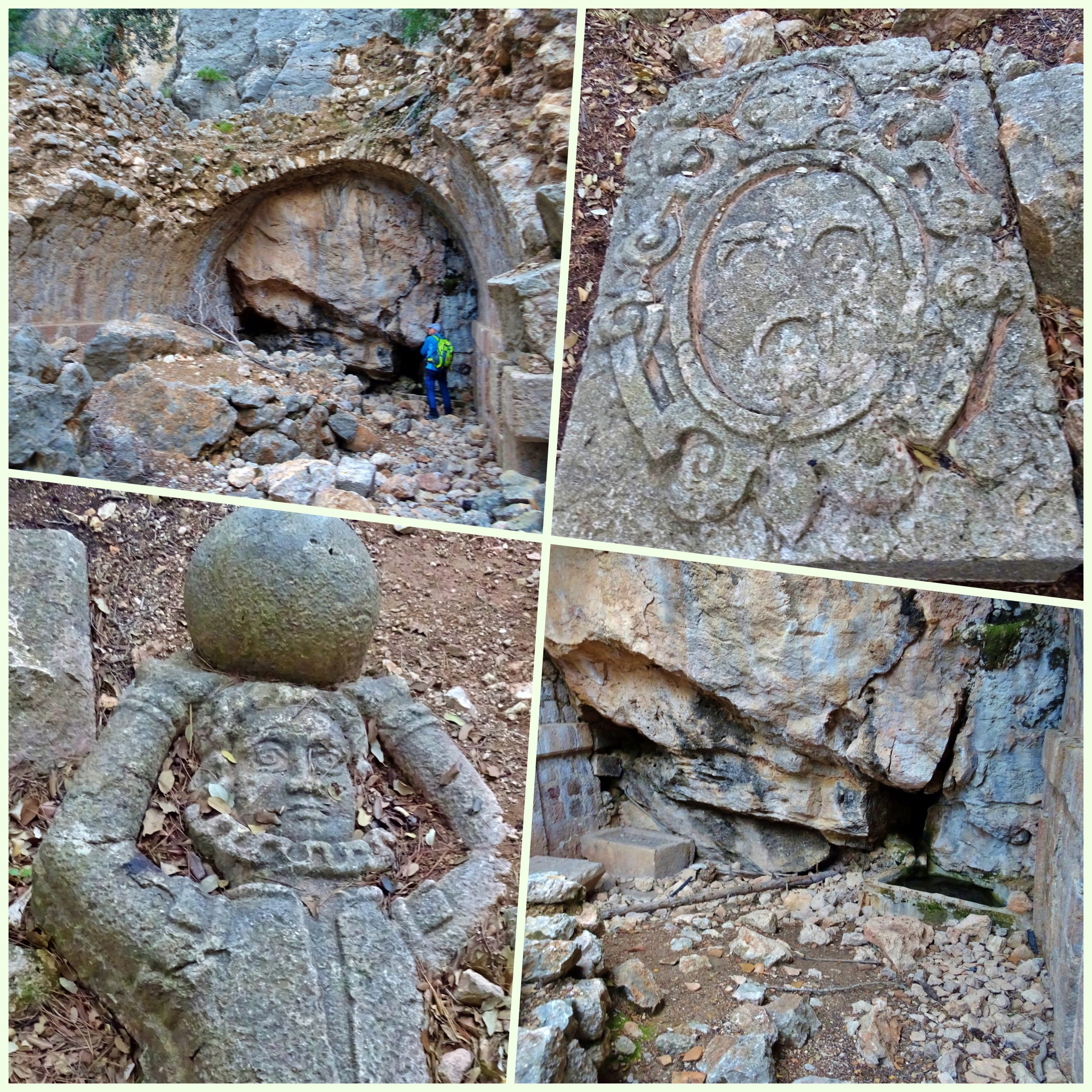 “Al peu d’una abrupta roca coberta d’heura es troba la gruta de Son Verí, amb dos arcs de mig punt a mode d’entrada, un capitell amb la data de 1591, i un frontó coronat pel bust d’una figura humana amb una esfera al cap; en el timpà apareixen el nom de Jesús i un escut d’armes amb mitja lluna; als costats, copes heràldiques amb bolla i botó. L’interior presenta una volta de canó; al fons, roques i una font les aigües de la qual vessen per sengles piques a dreta i esquerra, bé que d’aquesta només vessa quan plou. Digne de menció és l’ampla llosa que a mode de taula descansa sobre potes tallades en forma de dofí. Unes pilastres laterals mostren una senzilla ornamentació.”