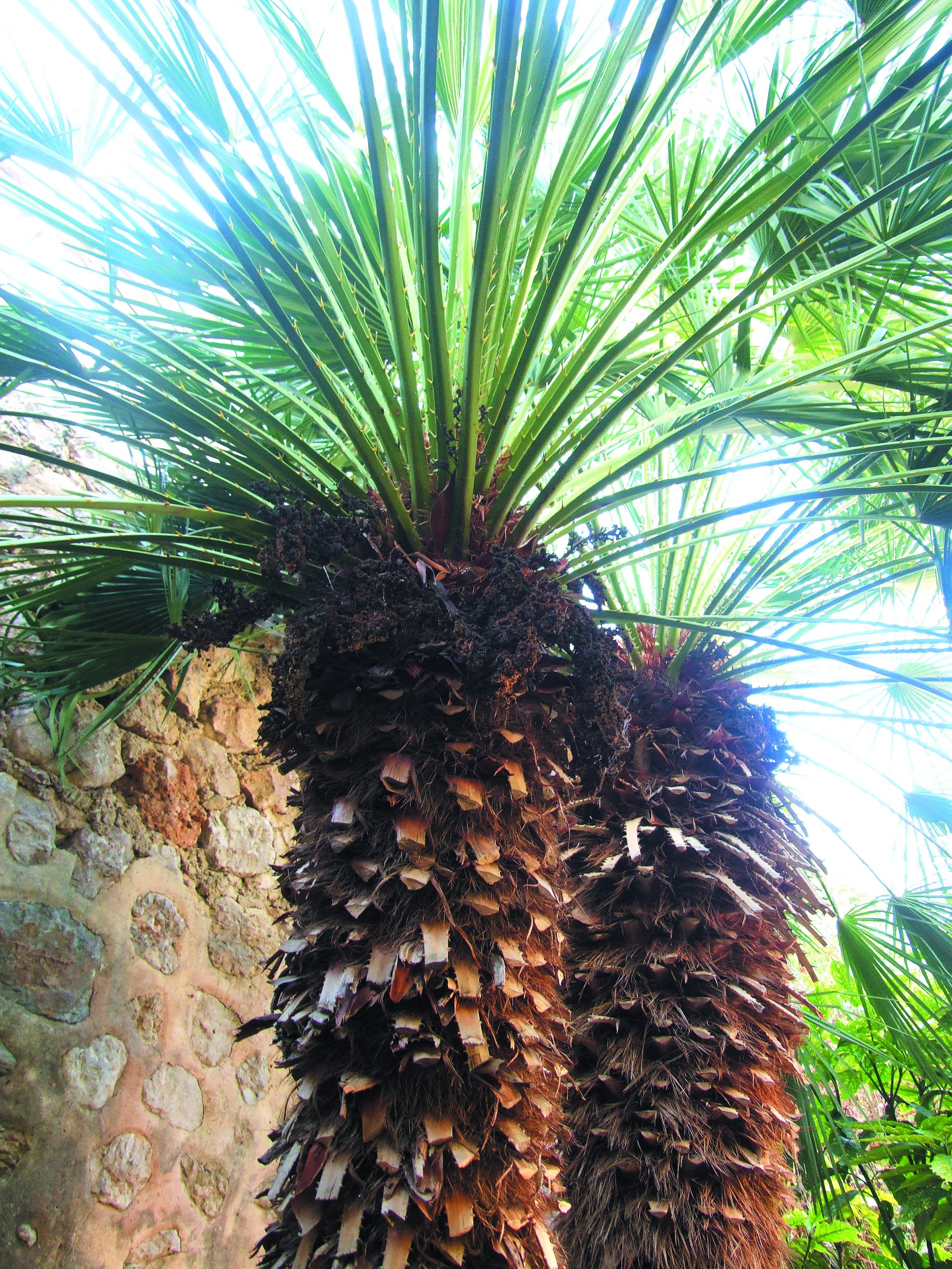 La principal característica d’aquest arbust és el seu tronc columnar que pot arribar a superar amb facilitat els dos metres d’alçada, així com les seves fulles grosses i en forma de ventall, amb pecíols proveïts d’espines vulnerables. Les seves flors són grogues -sol florir entre els mesos d’abril i juny- i es distribueixen en raïms densos, donant uns fruits semblants als dàtils que a la nostra comunitat s’anomenen palmissons.