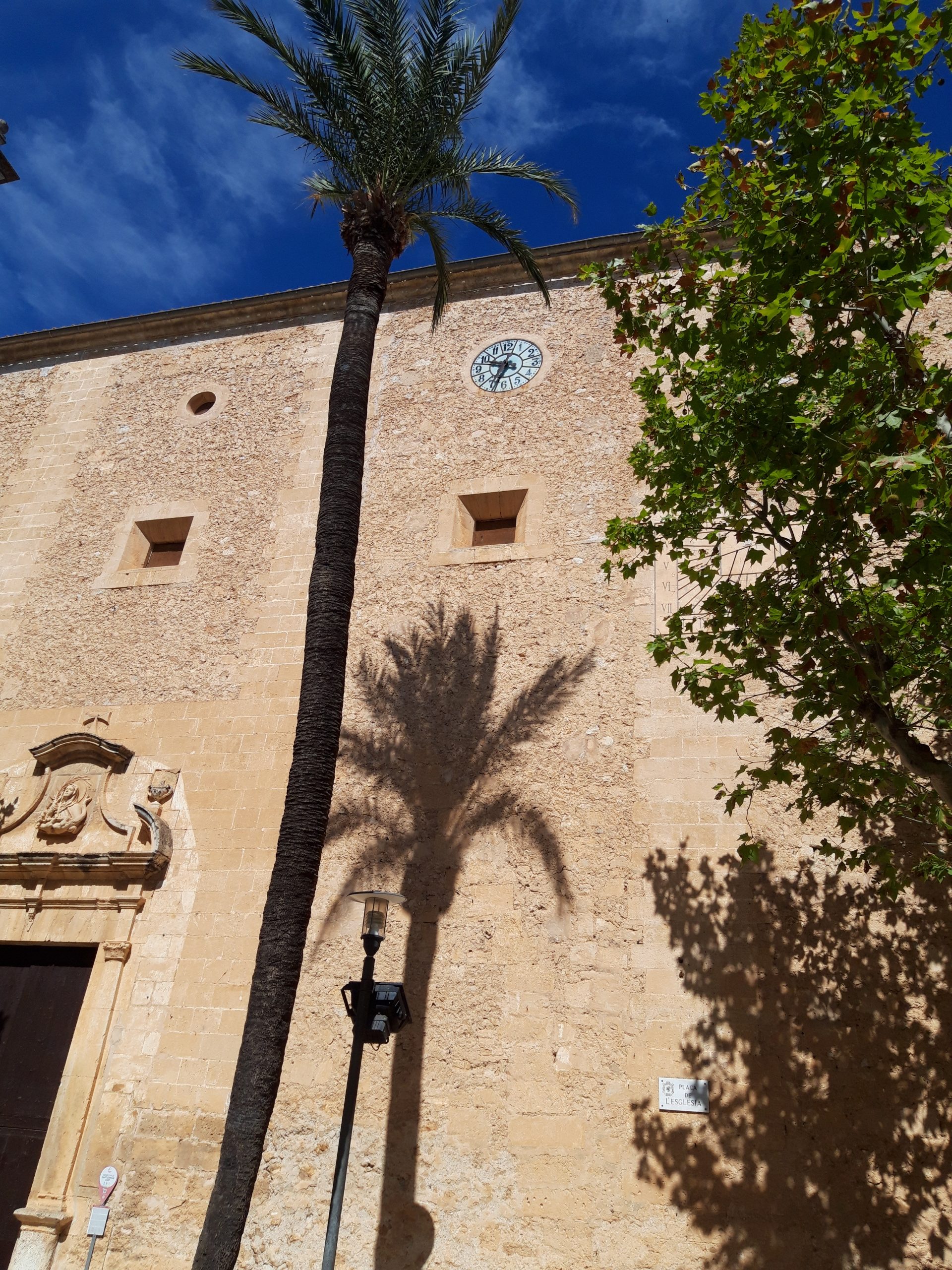 Qualsevol matí assolellat, quan l’astre rei deixa guaitar els seus rajos pel balcó del llevant, dibuixa sobre el llençol petri de la façana lateral de l’església parroquial de sa Pobla, una estampa impregnada de bella plasticitat. Es contemplen, amb el campanar de fons, al costat del rivetat de la portalada menor del temple, l’esfera del rellotge mecànic eclipsada per les branques de la seva palmera guardiana i la seva pròpia ombra reflectida sobre el mur, just al costat d’un centenari rellotge de sol i les restes de l’esfera d’un primitiu rellotge que va lluir a la mateixa façana.