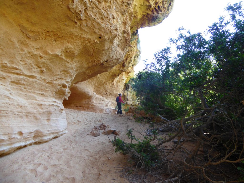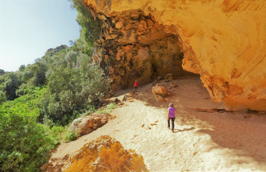 De mica en mica el terreny va canviant i el terreny càrstic, calcari es va mesclant amb l’arenisca. Sembla que l’aigua, en la seva cerca de la mar, ha anat tallant el que són formacions dunars fossilitzades. Tres enormes balmes, com a mínim, ens cridaran l’atenció i mereixen un visita. Tots els matisos del color groc, del taronja més viu fins a un blanc trencat, ens sorprendran a la vista. En algun moment tindreu la sensació que heu arribat a una platja o que esteu trescant per les dunes d’algun desert, ja que la finor i textura de la sorra us ho podria fer pensar si tanqueu els ulls. Damunt dels cingles s’insinuen alguns tancaments en pedra amb els arbres de les finques abocant-se a la balconada del torrent.
