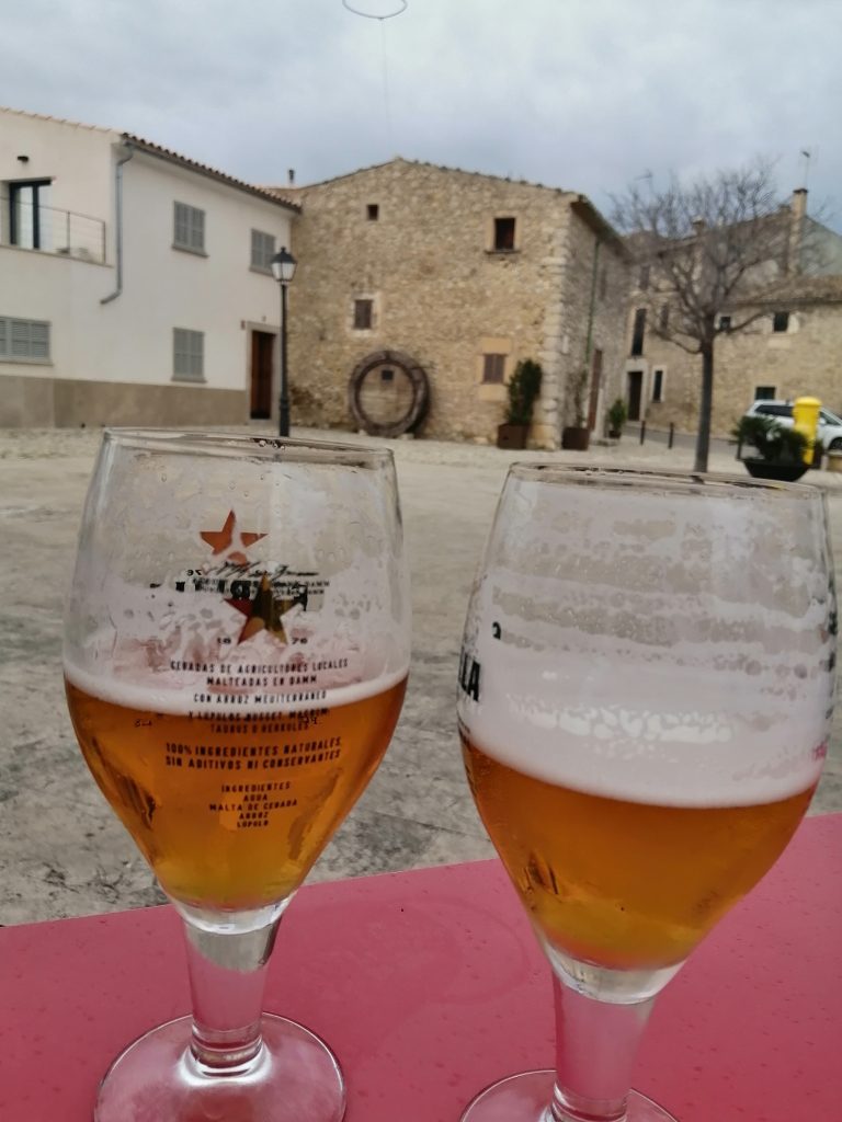 Es divisa el campanarmoscarienc. Arribarem a fer l’aperitiu. I ens aturam a la Plaça Major de Moscari amb la vista posada a la casa de na Margalida Ferrera. I amb uns beures al bar de sa Plaça…. on, gairebé per art de màgia, compareix en Tomeu, qui regenta el bar-restaurant. Sempre per a nosaltres Tomeu des Canyar, Alcúdia ens uneix. Visitam l’interior del bar, al pati a l’escletxa es veu Campanet, i ens observa una de les cares d’escultures del passat de Jaume Poma.