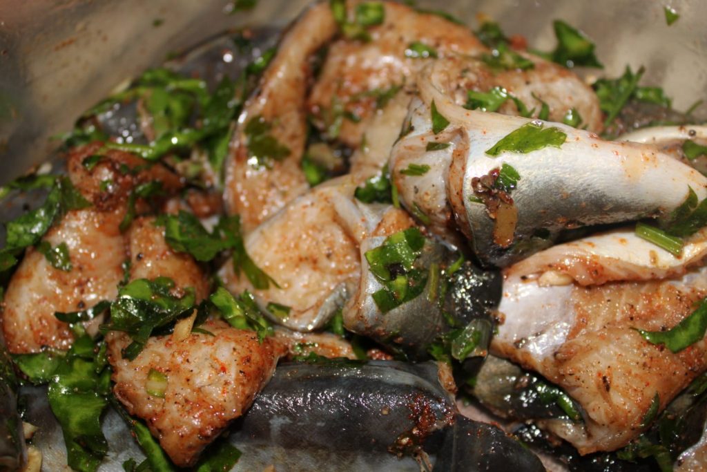 Les anguiles tallades, ja netes i eixutes se trempen amb alls, julivert i oli i pebre bord i pebre vermell. Es preparen el dia abans i reposen una nit. S’hi ve de gust es pot posar pebre de tap de cortí coent. La padrina Rua hi tallava ceba tendra ja amb les anguiles i així agafava el gust.