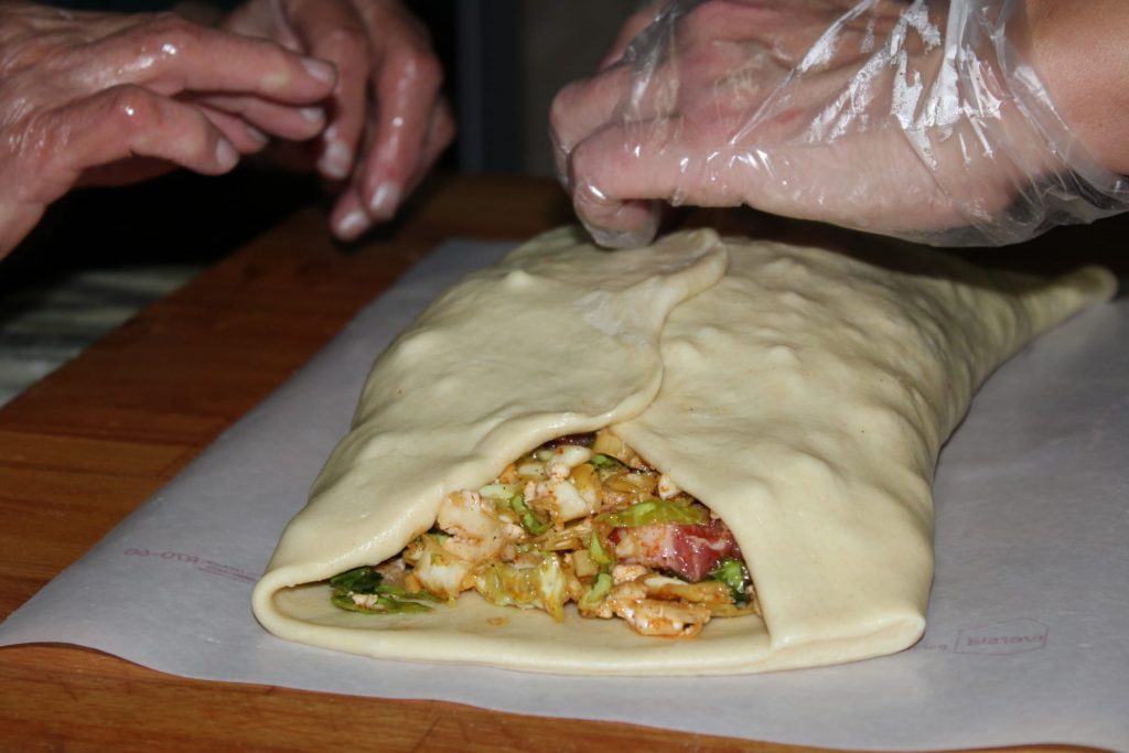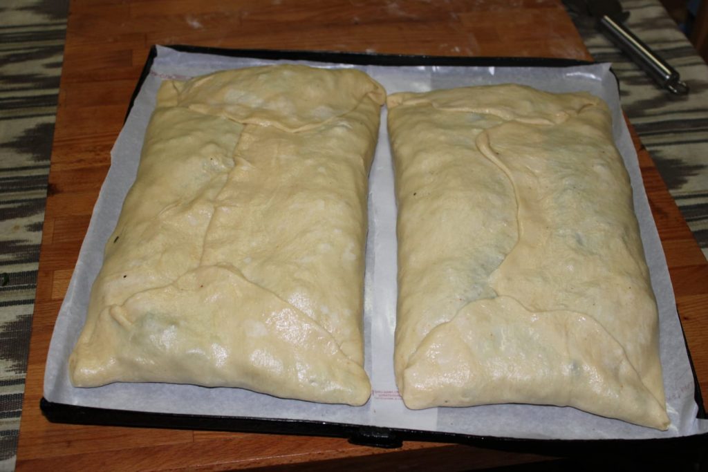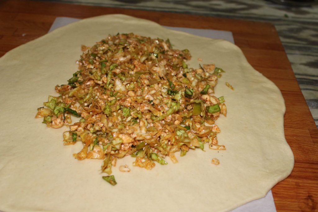 Una vegada feta l’espinagada, la pasta s’escampa amb una forma rodona amb l’aprimador, i al centre s’hi posa un sostre de verdura, enmig dues files d’anguiles, una per banda al llarg de l’espinagada, tallades, en fila i se torna posar un sostre de verdura. Així l’anguila cou ofegada. Una vegada tapada l’espinagada, que quedi rectangular, als costats la pasta s’entrecolca enmig i als caps superposats com si fos un sobre. Se procura tenir el forn calent. S’enforma l’espinagada un quart d’hora, a foc alegre i després se baixa el foc i es mantén tres quarts d’hora i sempre vigilant el color.