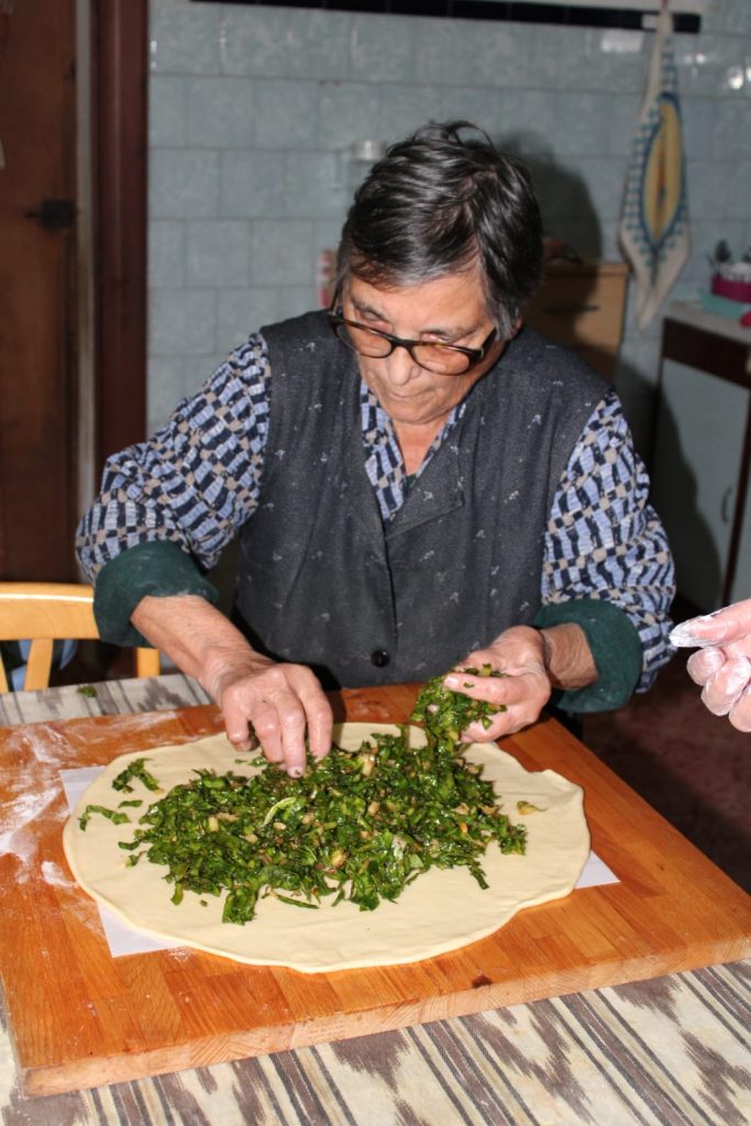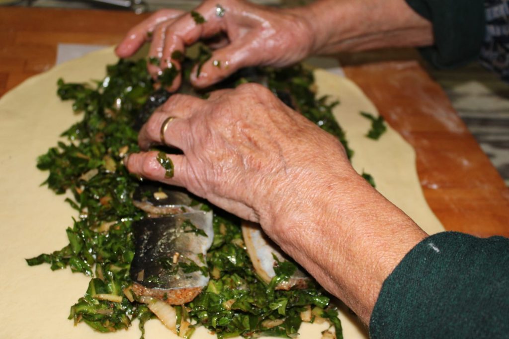 L’endemà es talla la verdura, bledes, alls i ceba tendra, tant la part blanca com la verda. Tot trempat amb sal, oli, pebre bor, pebre coent al gust, amb moderació, tenint en compte que les anguiles han passat la nit amb alls, julivert i oli. La padrina Cati hi posa bledes, espinacs i carxofa tendra. També s’hi poden afegir pèsols.