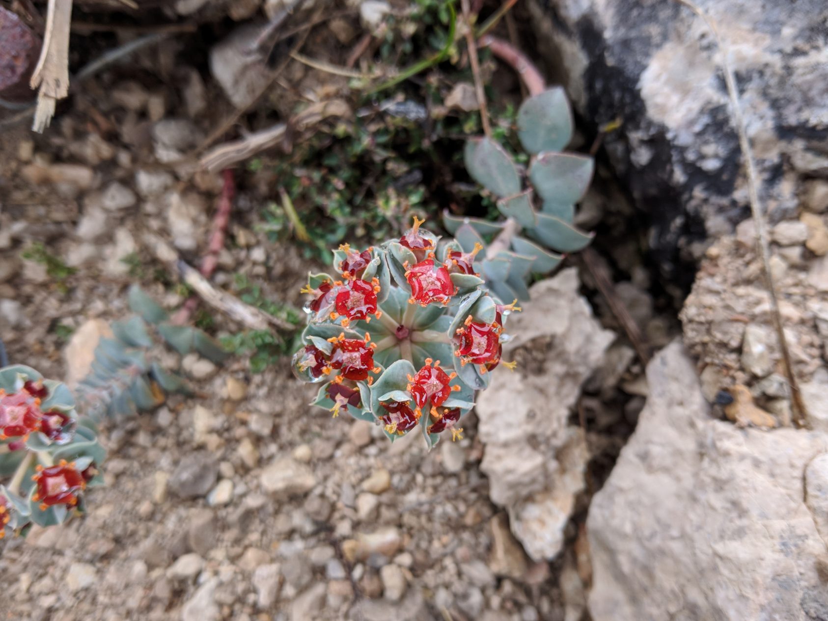 Aquesta espècie té menys de 2.000 peus i un percentatge reduït de reproductors (menys del 10 per cent). Es tracta d’una planta perenne de pocs centímetres d’alçària que floreix a finals de primavera. Presenta tiges subterrànies (rizoma) que permeten la reproducció asexual. Les flors (unisexuals) es reuneixen en una estructura característica anomenada ciati, portador de glàndules nectaríferes de color porpra, motiu pel qual l’espècie no passa desapercebuda en el moment de la floració.