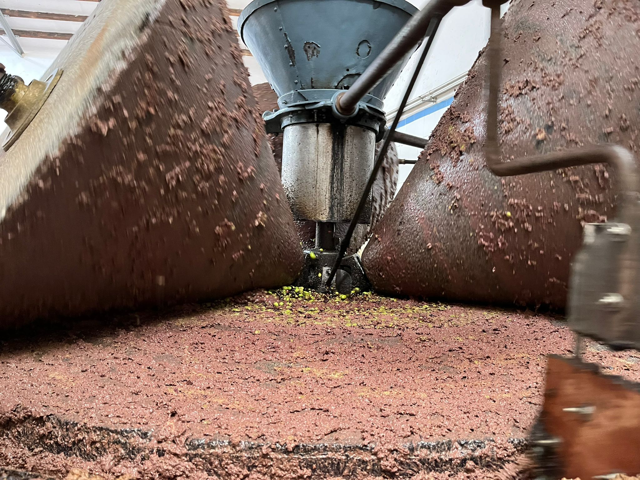 El procés continua amb la molturació. Tradicionalment, la tafona utilitza una mola de pedra que aixafa les olives i en transforma la polpa i el pinyol en una pasta homogènia, punt de partida imprescindible per a l’extracció de l’oli. Can Det és, de fet, la darrera tafona de les Illes Balears que manté aquest sistema tradicional: un molí de tres pedres còniques que giren sobre una base de pedra de prop de 2,5 metres de diàmetre. A més, s’hi continuen emprant els cabassos i les premses hidràuliques clàssiques, preservant així unes pràctiques carregades d’història i profundament arrelades a la vida familiar del molí.