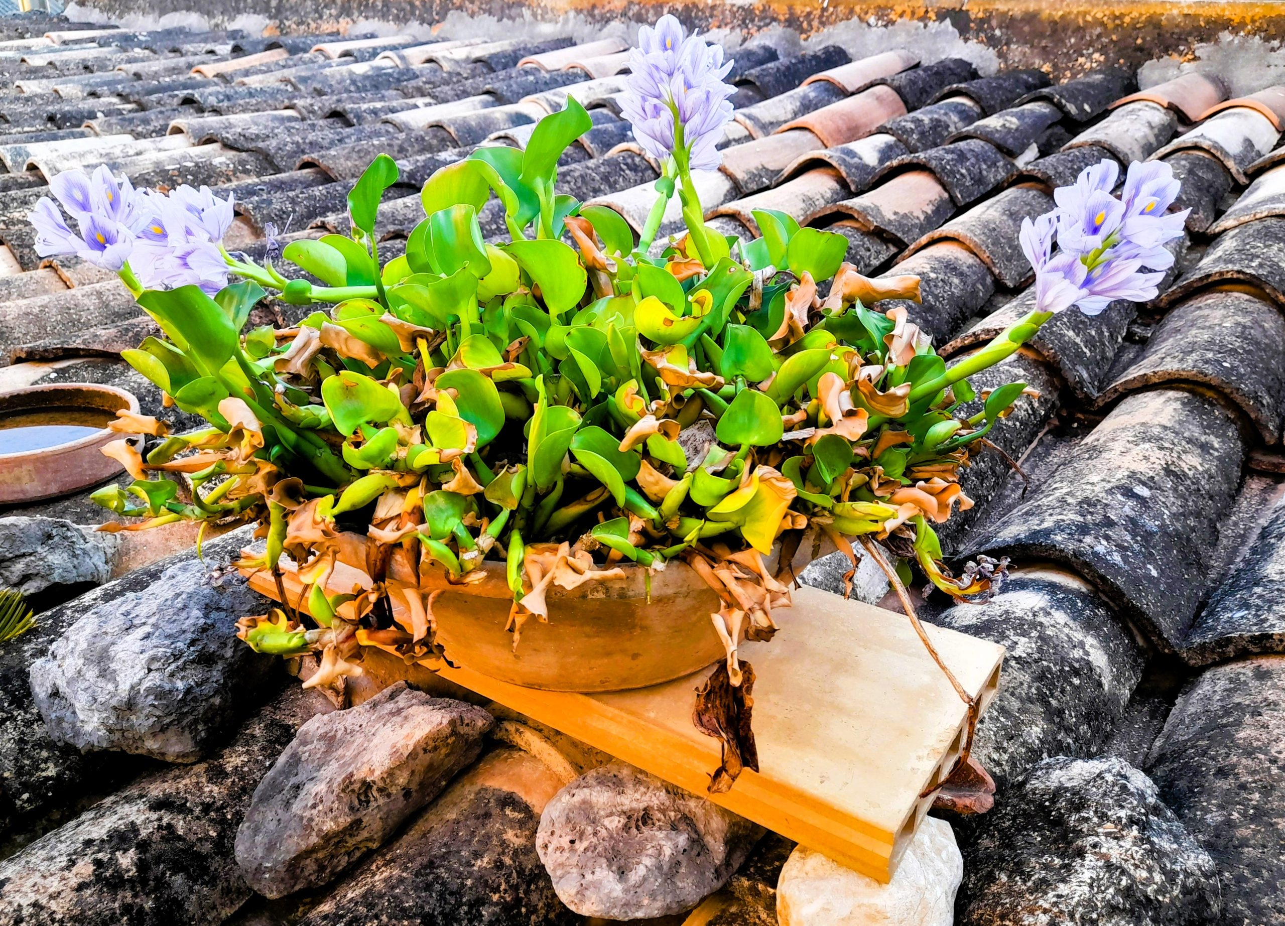 Sempre, a la nostra terrassa, hi ha un ribell gros, d’aquests que empraven els nostres padrins quan mataven els porcs, els mesos d’hivern, ple d’aigua, amb els coneguts i colorits jacints d’aigua (Eichhornia Crassipes), espècie flotant perenne d’arrels submergides, que aparentment no tenen tija, proveïts d’un rizoma, molt particular, emergent, del que s’obre una rosassa de fulles amples (de 10 a 20 centímetres), gruixudes i lluents i pot arribar a emergir prop d’un metre per fora de la superfície de l’aigua, amb una superfície esponjosa notablement inflada, en forma de globus, que forma una bufeta plena d’aire, gràcies a la qual les plantes poden mantenir-se sobre la superfície de l’aigua.