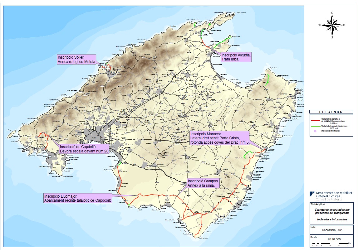 El projecte de senyalització de les carreteres construïdes amb mà d’obra esclava durant el franquisme inclou sis panells informatius de 3 metres d’alçada i 1,5 metres d’ample que estaran situats als municipis de Sóller, Calvià, Alcúdia/Pollença, Manacor, Llucmajor i Campos, i recordaran la història de totes aquestes persones i l’origen de les carreteres.