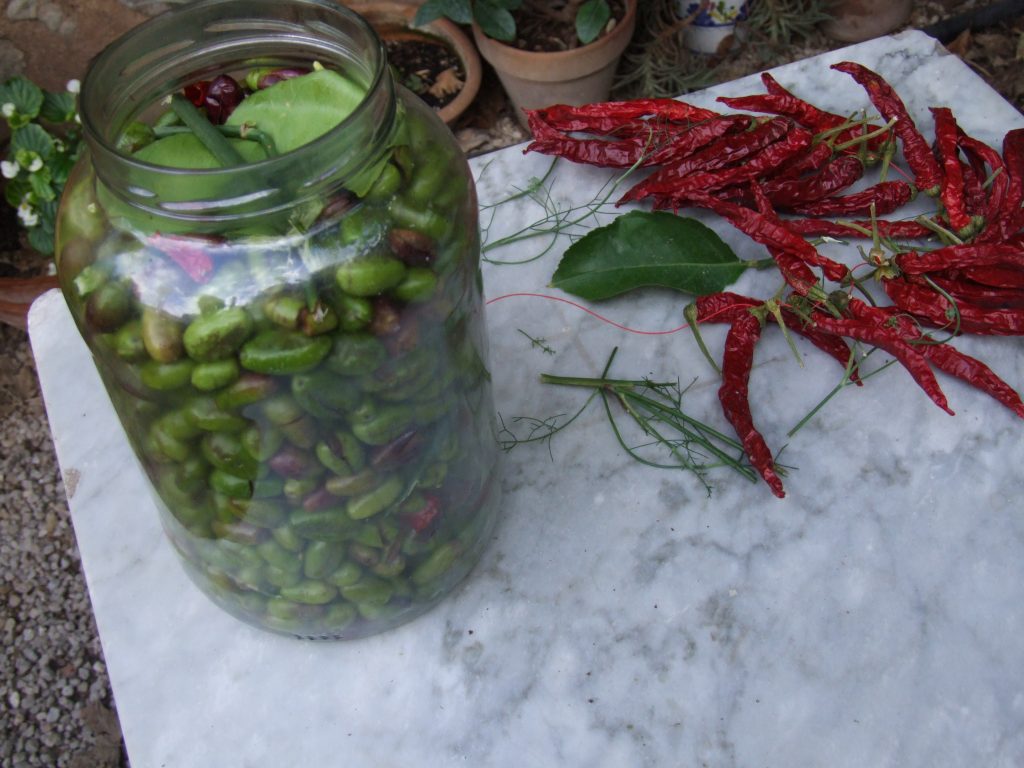 Per a una correcta maceració convé afegir a les olives trencades trossos de troncs de fonoll i de pebres de cirereta, així com fulles de llorer i llimonera –i depenent del gust casolà, alguns alls esclafats- abans d’omplir els recipients amb l’aigua-sal.