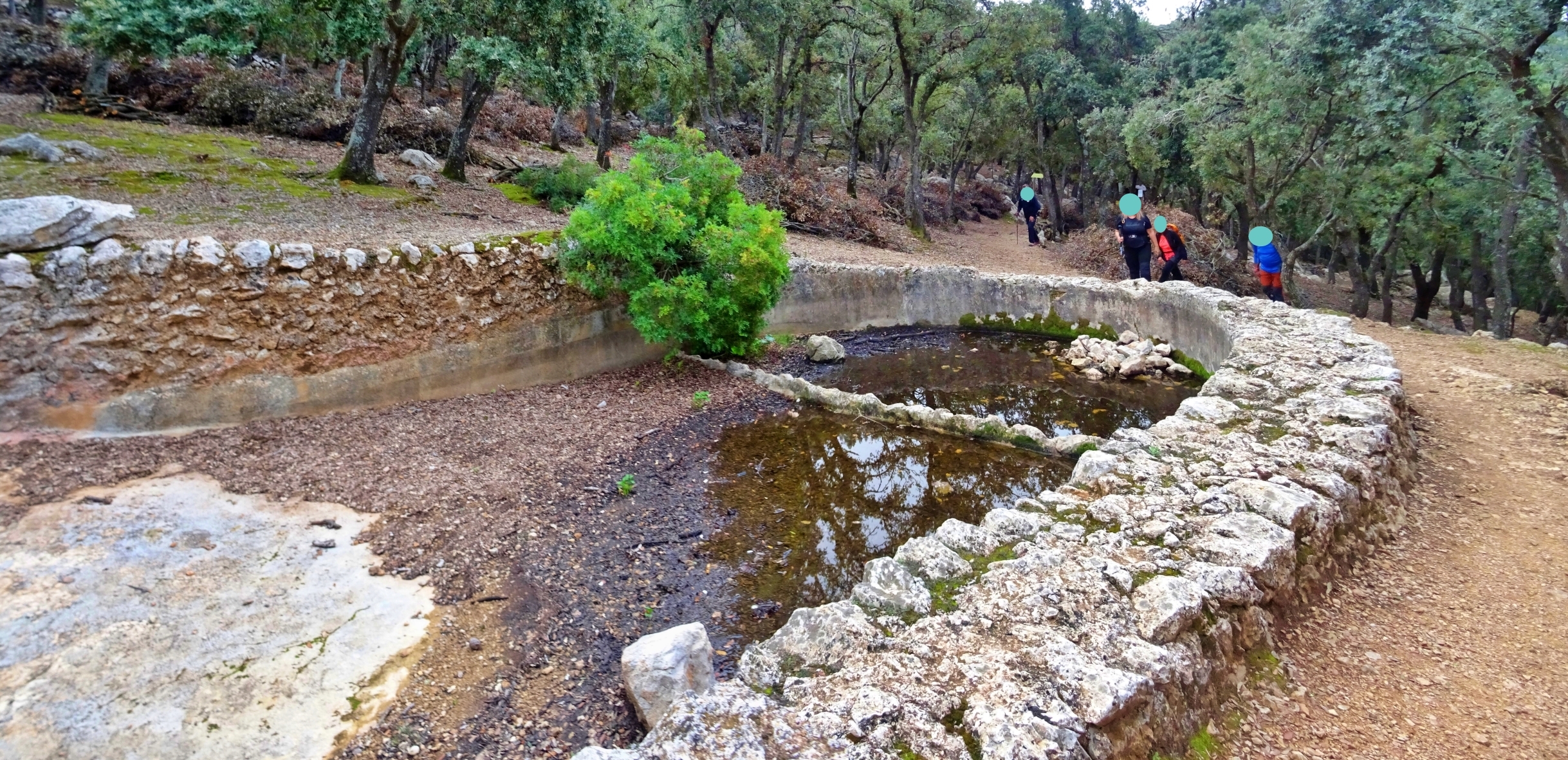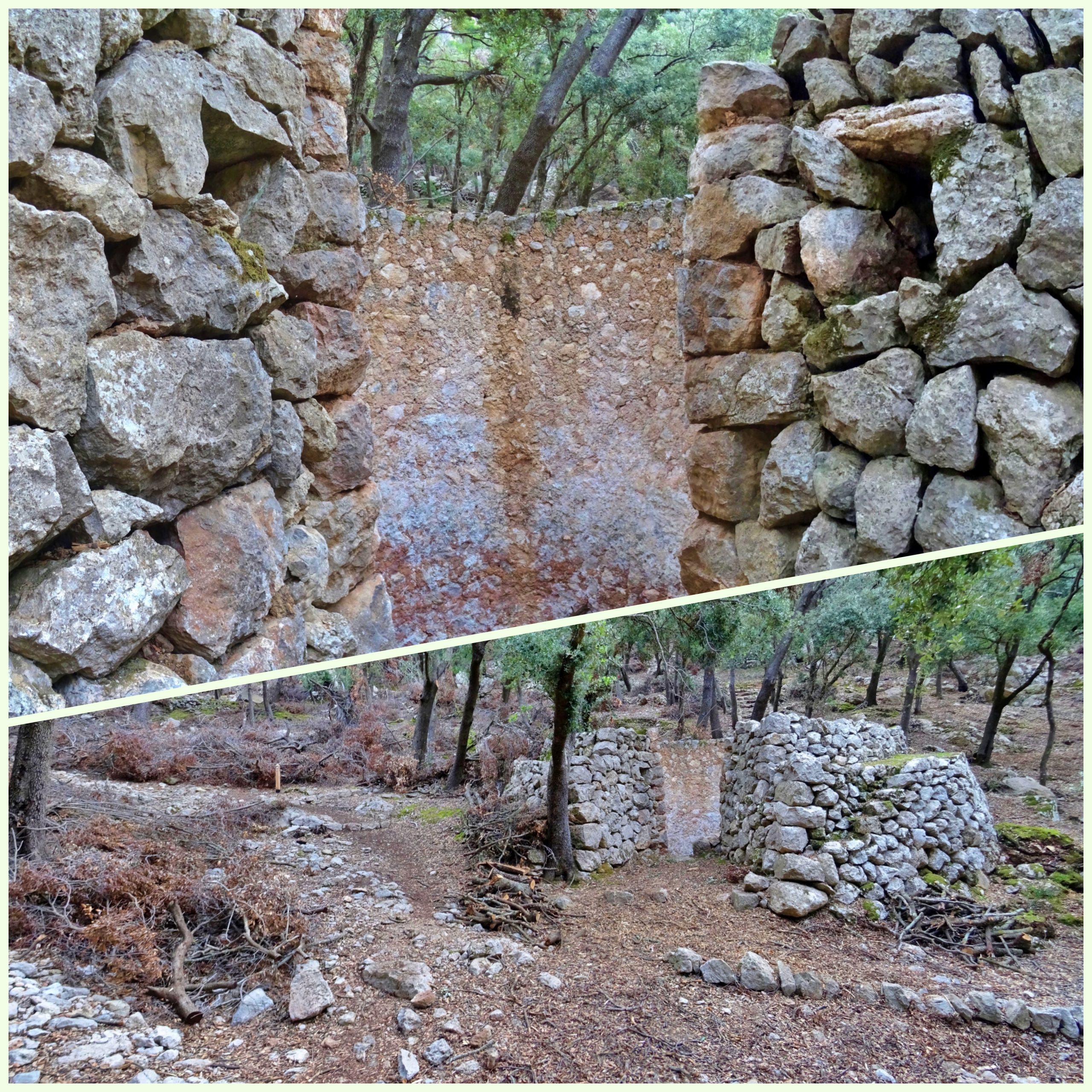 Localitzarem una petita construcció a la dreta que facilitava l’extracció de l’aigua de la Font de Na Rupit, avui en dia malmesa i abandonada. A l’esquerra els cingles del Puig dels Boixos es precipiten cap a la vall, deixant intuir alguns dels passos més populars, com el dels Cocons i el de Sa Cova.