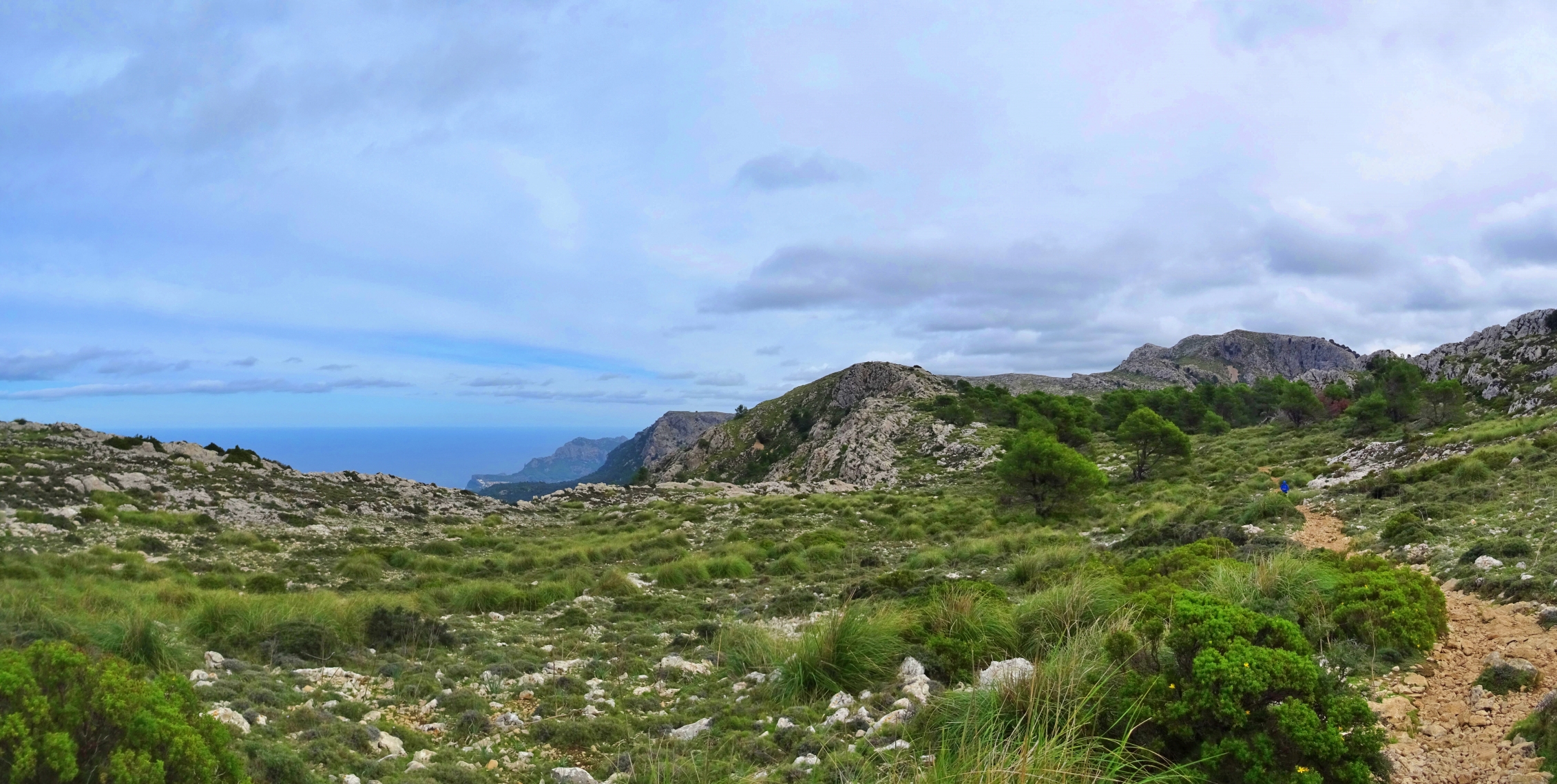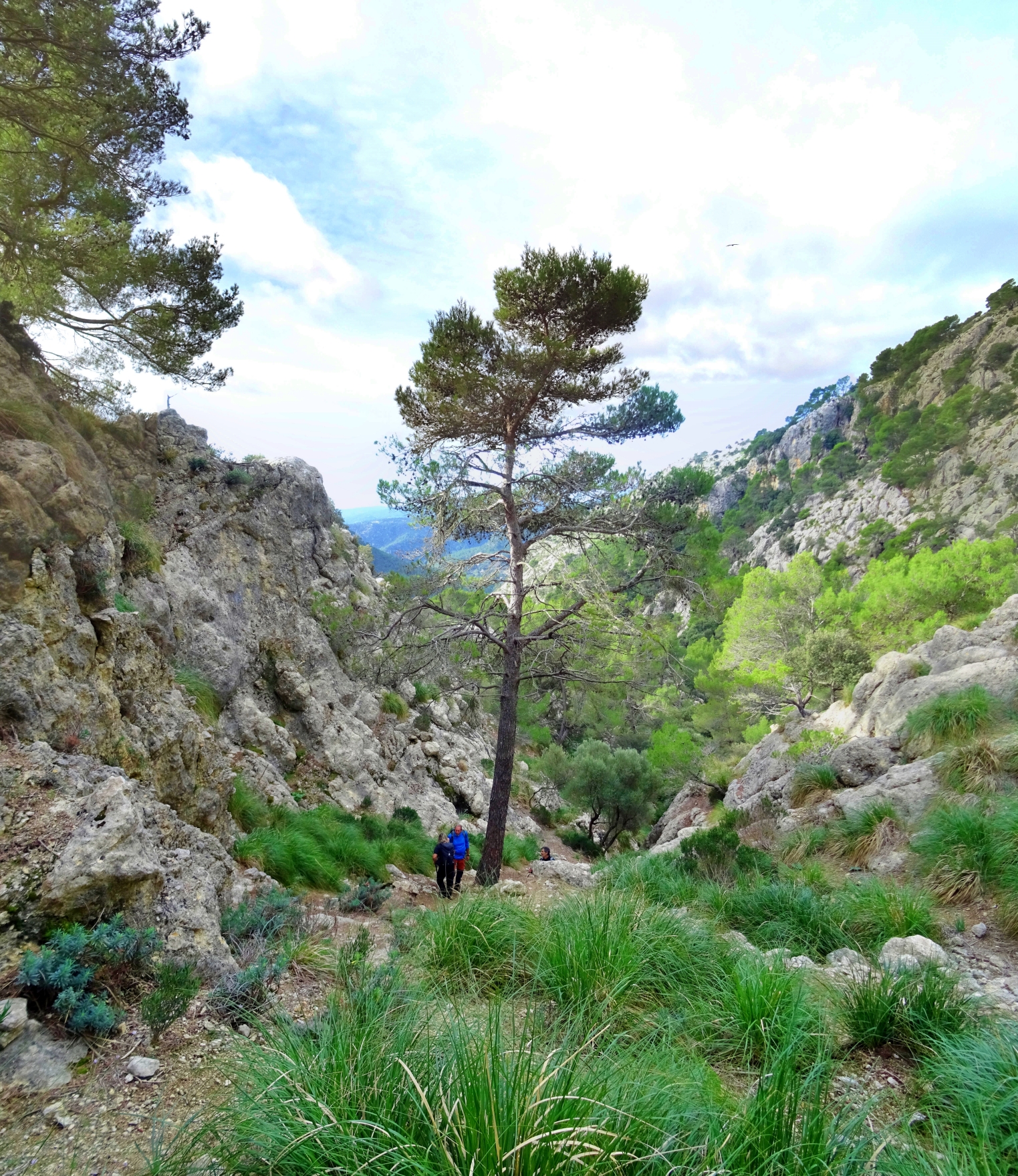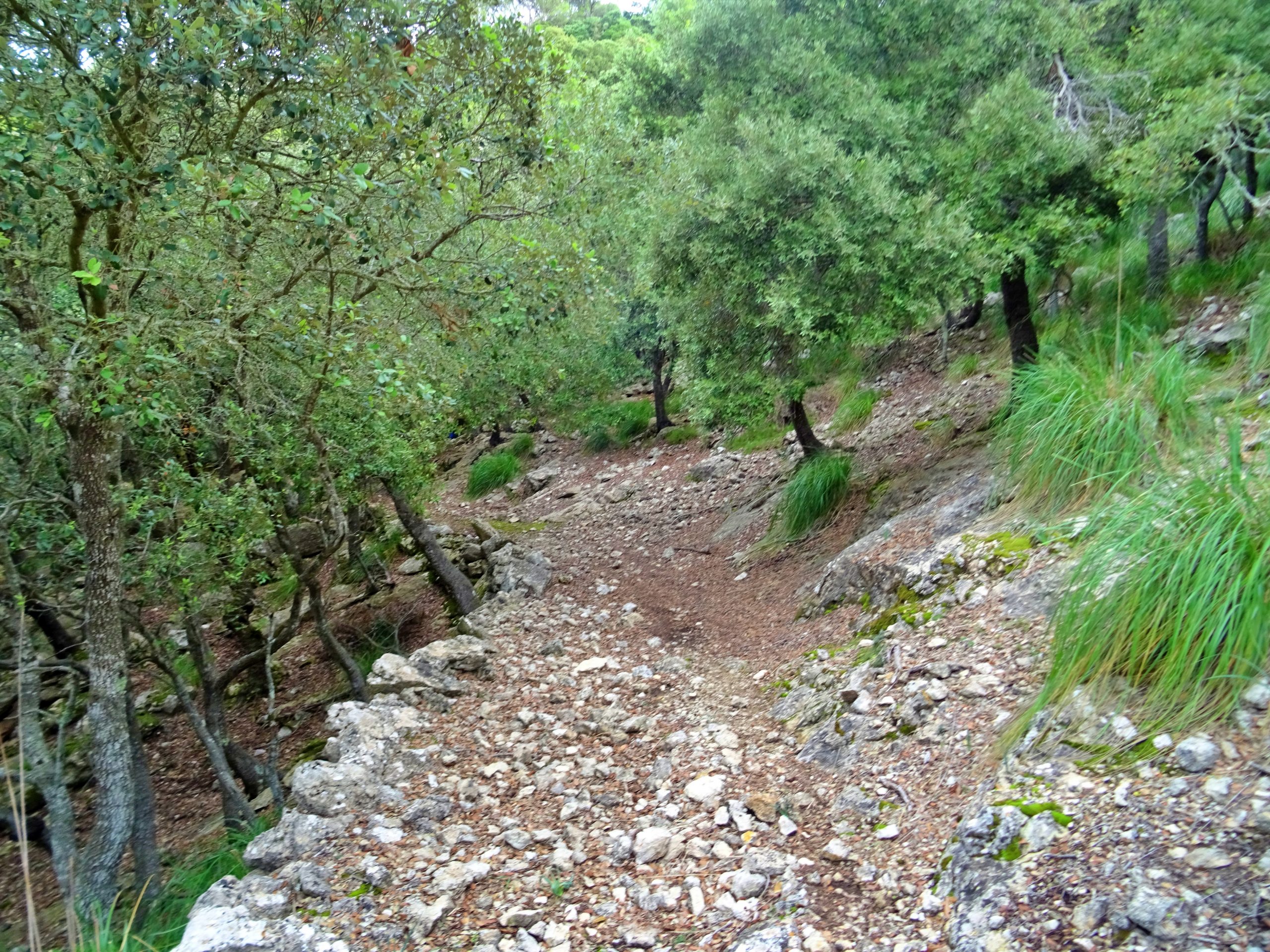 Represa la caminada, transitarem per un bosc d’alzines en el que anem guanyant metres fàcilment. L’alegria dura poc en la casa del caminant i ben aviat ens enfrontem a una canal en què el pendent és important. El camí va d’un costat a l’altra bojament per intentar alleugerir l’esforç. Alguns grans pins vigilen silenciosament les nostres feines. Curt i intens. Fins que a la nostra dreta viem l’obertura en la roca que conforma el Pas de Sa Creu. Convé guaitar al altre costat per gaudir de la visió de la Coma dels Cairats