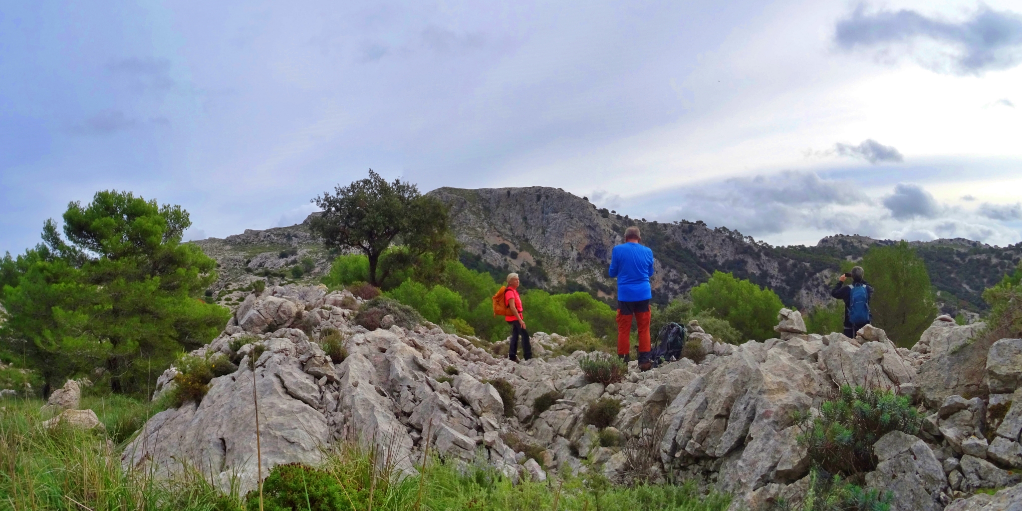 No desespereu. Just heu de girar per dirigir-vos cap a Ponent. Al cap de poques passes ja veureu la primera de les moltes fites que us guiaran a partir d’ara. Les petites columnes de pedres us internaran en una garriga amb predomini de l’alzina en constant i suau pujada. Els vostres peus faran camí damunt un terra moll i amable. Al cap d’uns quatre-cents metres veureu una muralla rocosa a la vostra dreta. Cap allà us menarà el fil d’Ariadna fet de monjoies. Superareu una primera acumulació de roques i, just davant, un altre. Si teniu ocasió de girar el cap a Llevant, i la meteorologia ho permet, veureu les parets del Teix i el seu cosí germà Es Teixot.