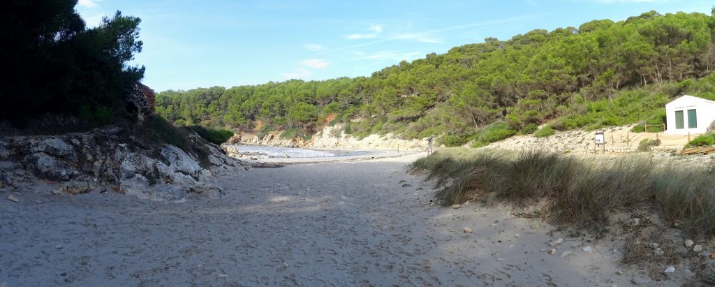 Gairebé un quilòmetre d’arenal ens esperen. Considerada com una de les platges verges més extenses del Sud de Menorca, amb aigües cristal·lines que atreuen els visitants. Amb poca profunditat, convida al bany i a l’esbarjo. Està integrat en l’ANEI (Àrea Natural d’Especial Interès) que comença a Cala Mitjana. En dirigirem cap a un conjunt de pins que tanquen el Barranc de Binigaus deixant a la dreta la Mola de Sant Adeodat. El barranc recull les aigües també del Barranc de Sa Torre Vella.