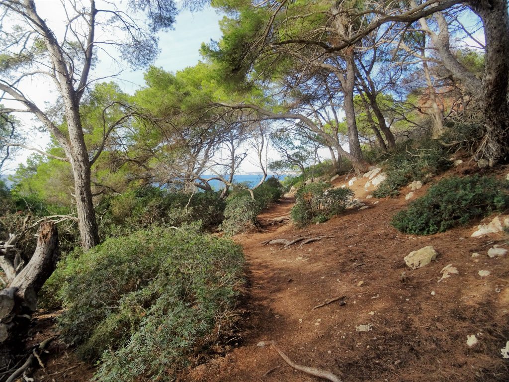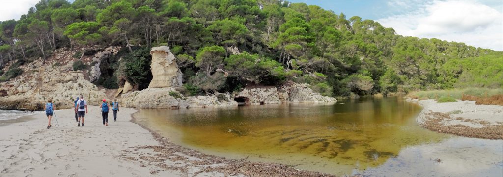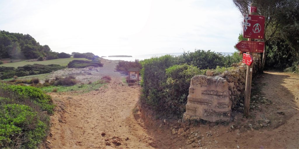 En aquest punt hem de parar atenció. Abandonarem el Camí de Cavalls, marcat per un indicador que assenyala cap a Cala Mitjana i Cala Galdana, per agafar el camí o sender litoral que transcorre per la costa.