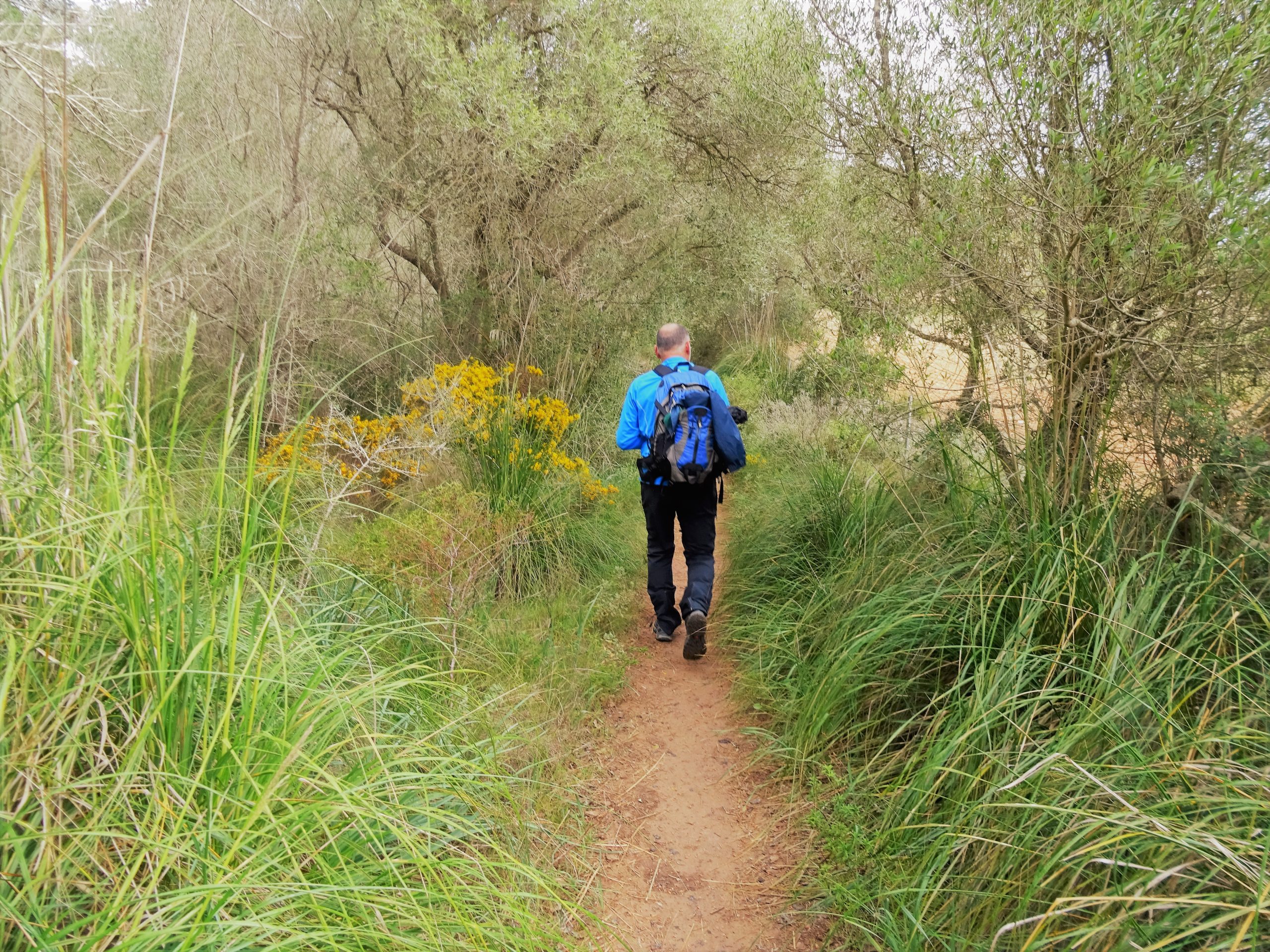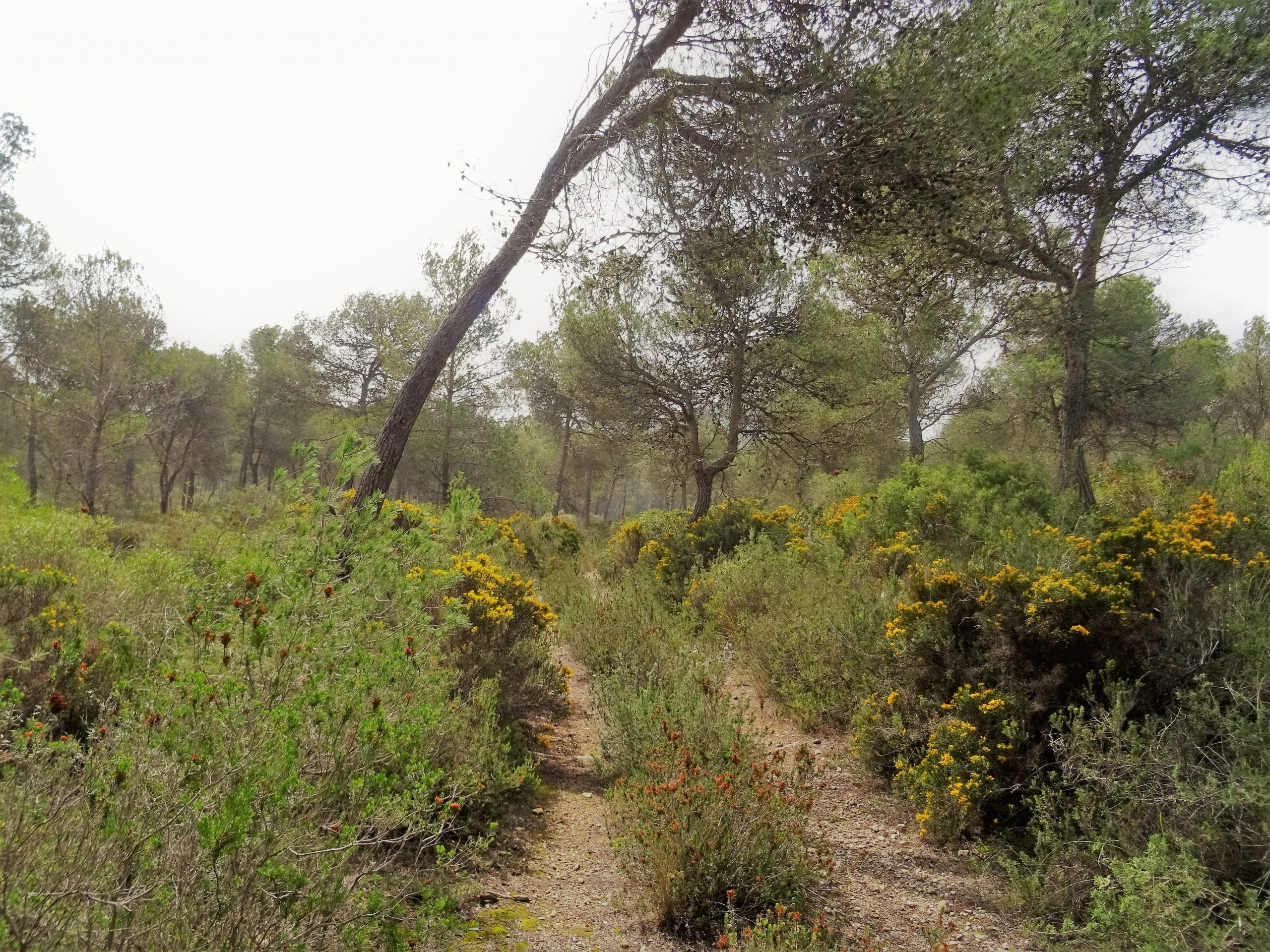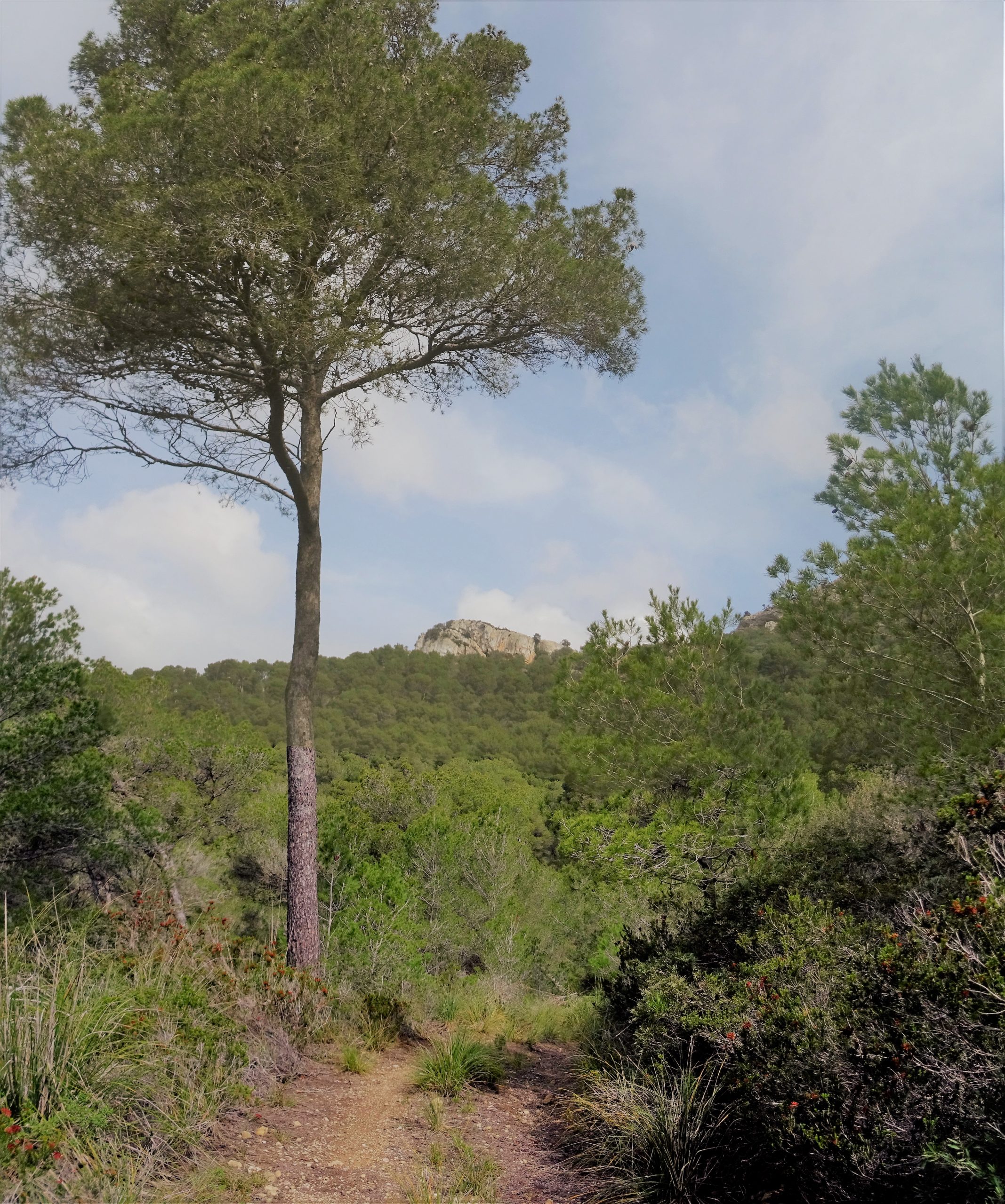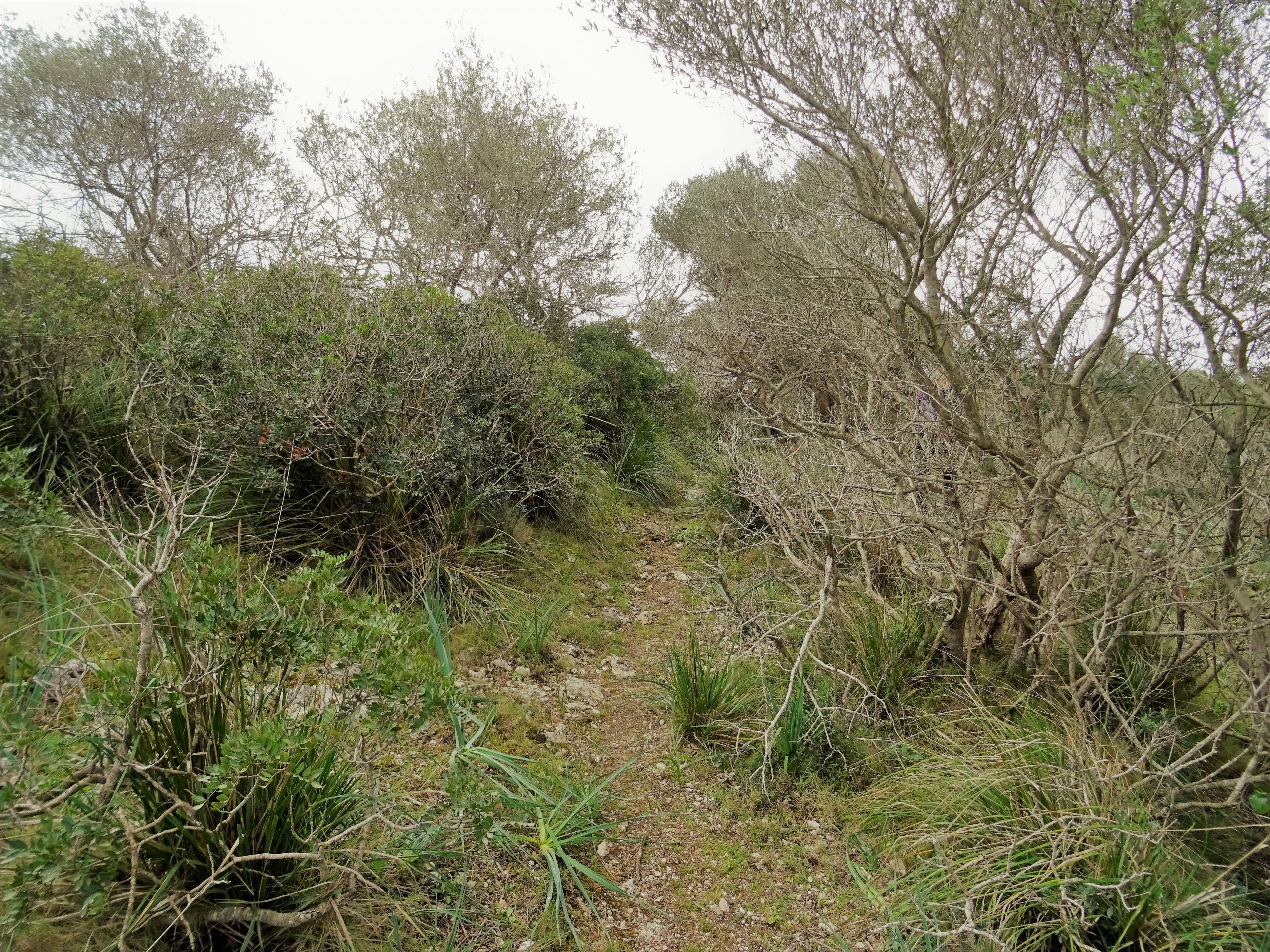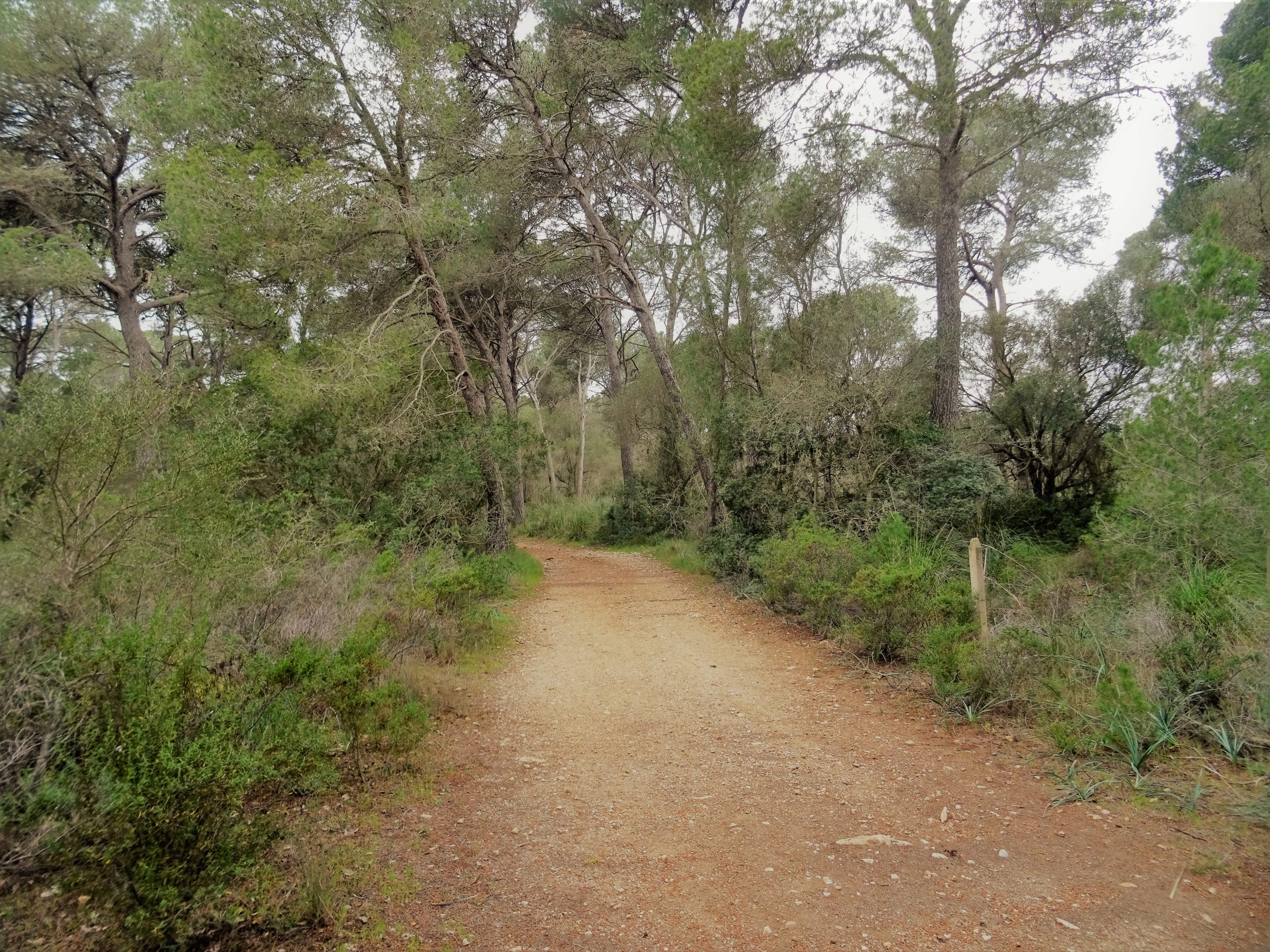 De mica en mica n’atraquem al final del Pla d’Almallia que està conformat per una garriga mesclada amb pins i garrovers. El camí torna estret i transita amb bosc a l’esquerra i camps obert a la dreta. En una cruïlla de camins hem d’agafar el que surt cap a l’esquerra i continuar cap al nord-est ignorant els desviaments tot dret fins a desembocar en el Camí des Puig de S’Alanar.