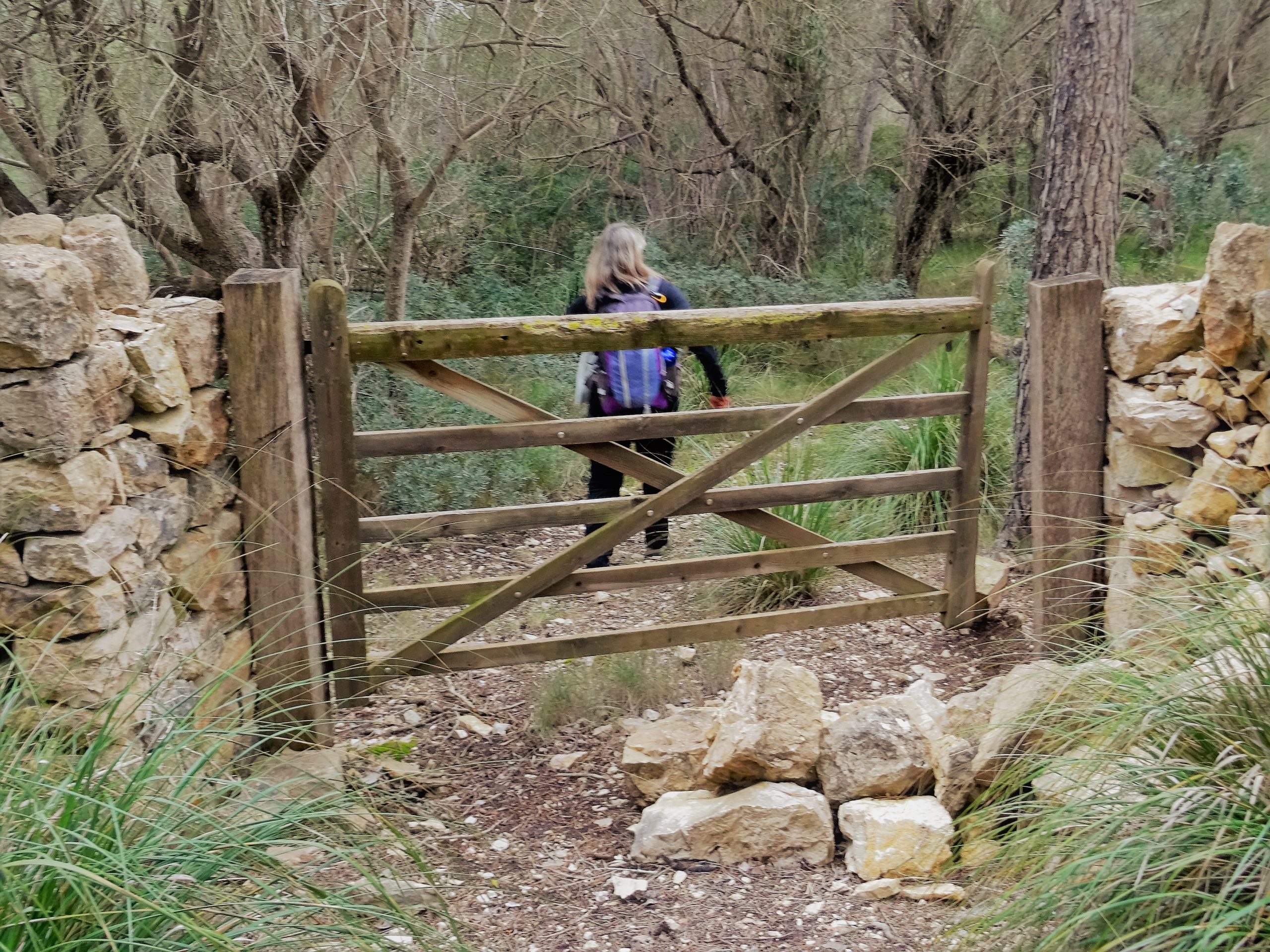Hem d’ignorar la pista que neix a un costat i que baixa. De nou la paret serà la nostra referència per l’esquerra. Arribats a un pany de pedra que la creua, veurem una portelleta de reixeta que hem de deixar tal com ho hem trobat. Un pocs metres més enllà la paret fa un gir en angle recte cap a l’esquerra. Som a Sa Mola Nova. Una balconada en què podem admirar la bella estampa de l’esplèndida vall que presideix el llogaret de Son Macià, distingible davant la serra desLlodrà.