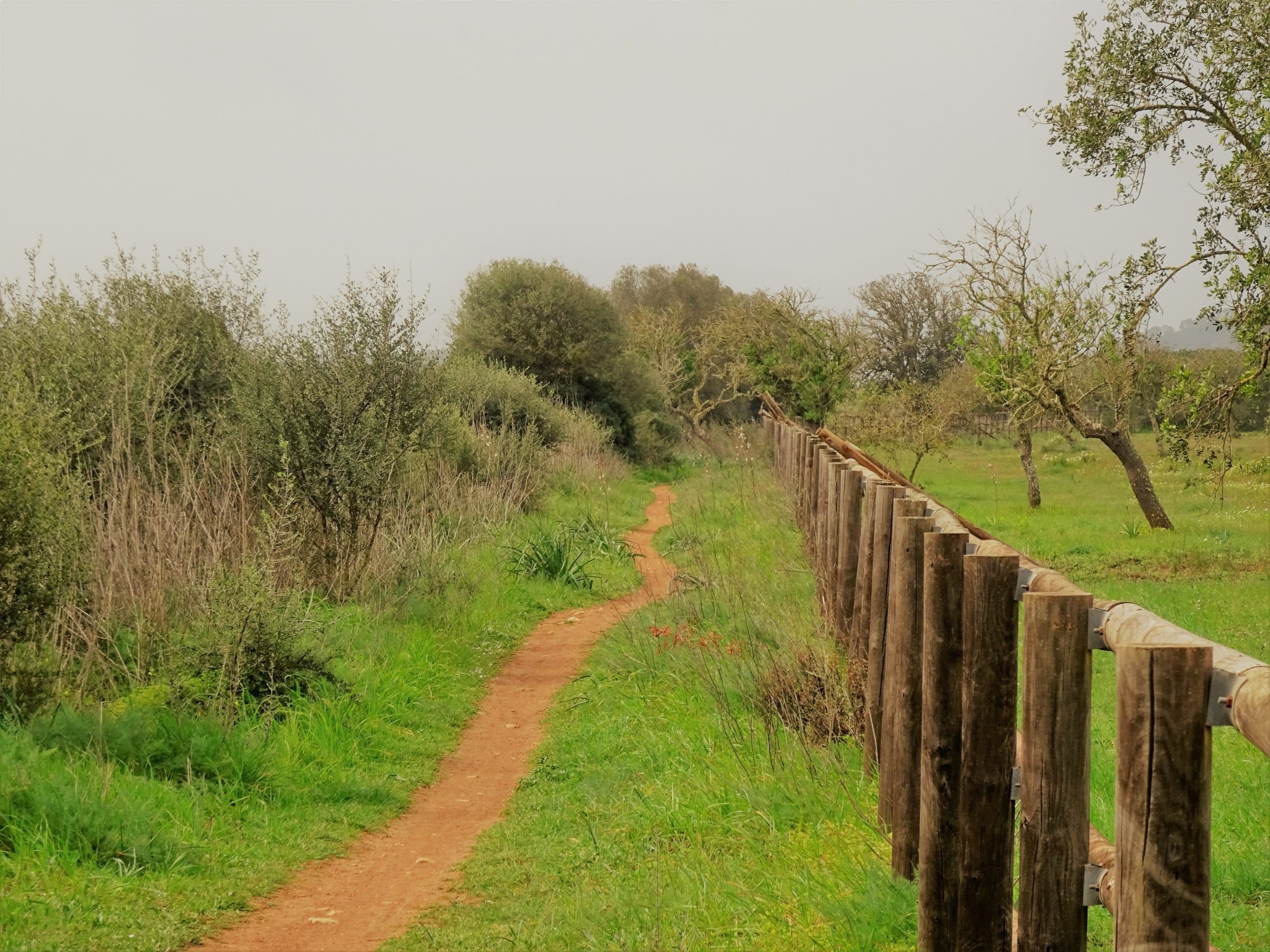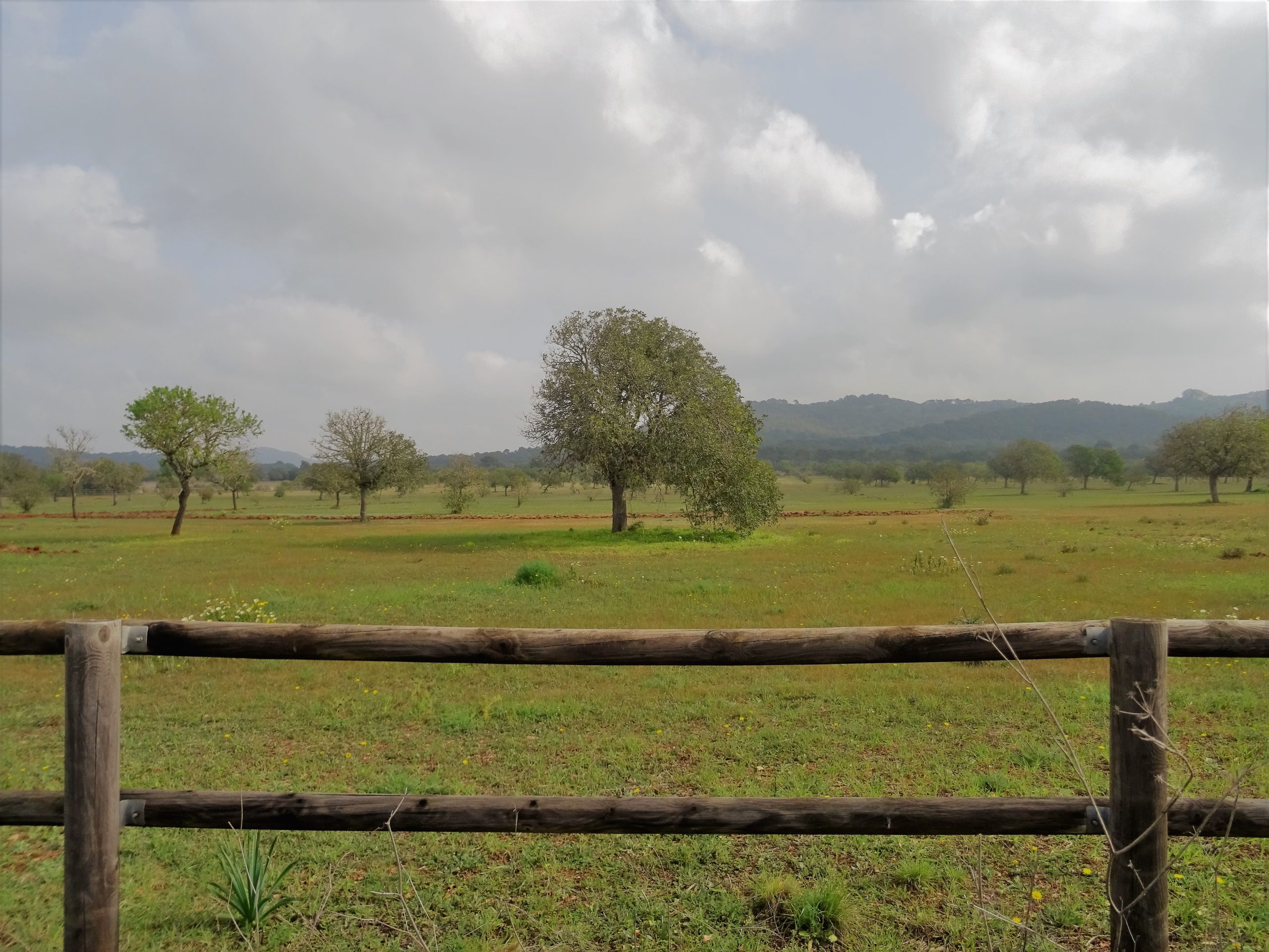Una fila d’ullastres i alzines ens dóna pas a un extens camp de secà amb garrovers i ametllers vells una mica descuidats. De nou ens acompanyen les altes barreres de fusta, ja que, pel que sembla, aquests camps s’han dedicat a pastures extensives per a cavalls. Si tenim bona vista distingirem les teulades de Son Brau, amb el Camí des Puig de S’Alanar que ens separà de les vinyes de Son Brau.