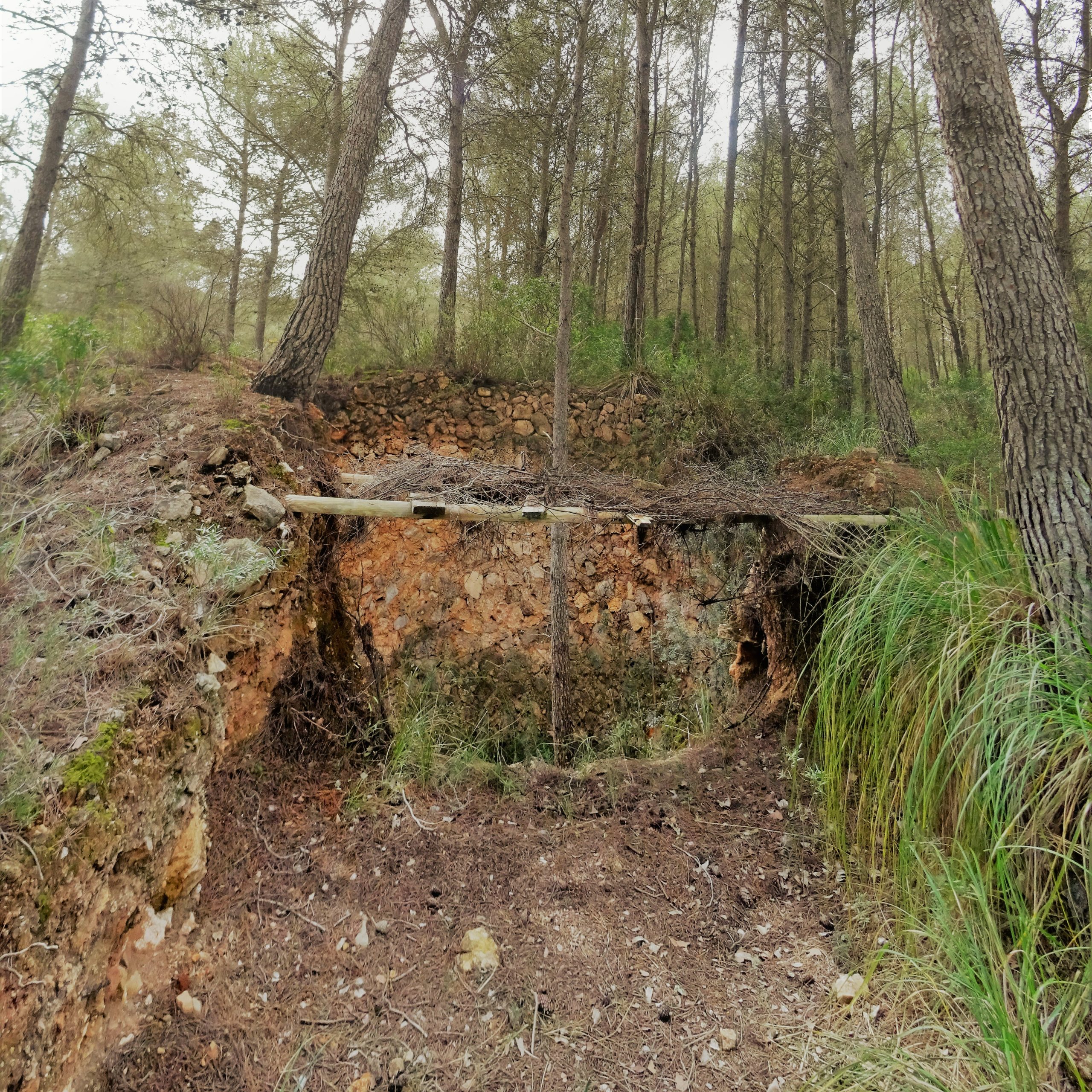 Ens dirigim al peu de les parets verticals i seguin una mica de tirany cap a l’esquerra. No serà fàcil i hem d’anar amb precaució. Arbres i males herbes ens sortiran al pas per donar-nos guerra. Si tenim paciència localitzarem una petita fesa amb mates de càrritx que facilitaran assolir la part superior. Alguns ullastres malèfics ens sortiran al pas, però hem d’anar cap a la dreta, tot seguint restes de tirany i alguna fita.