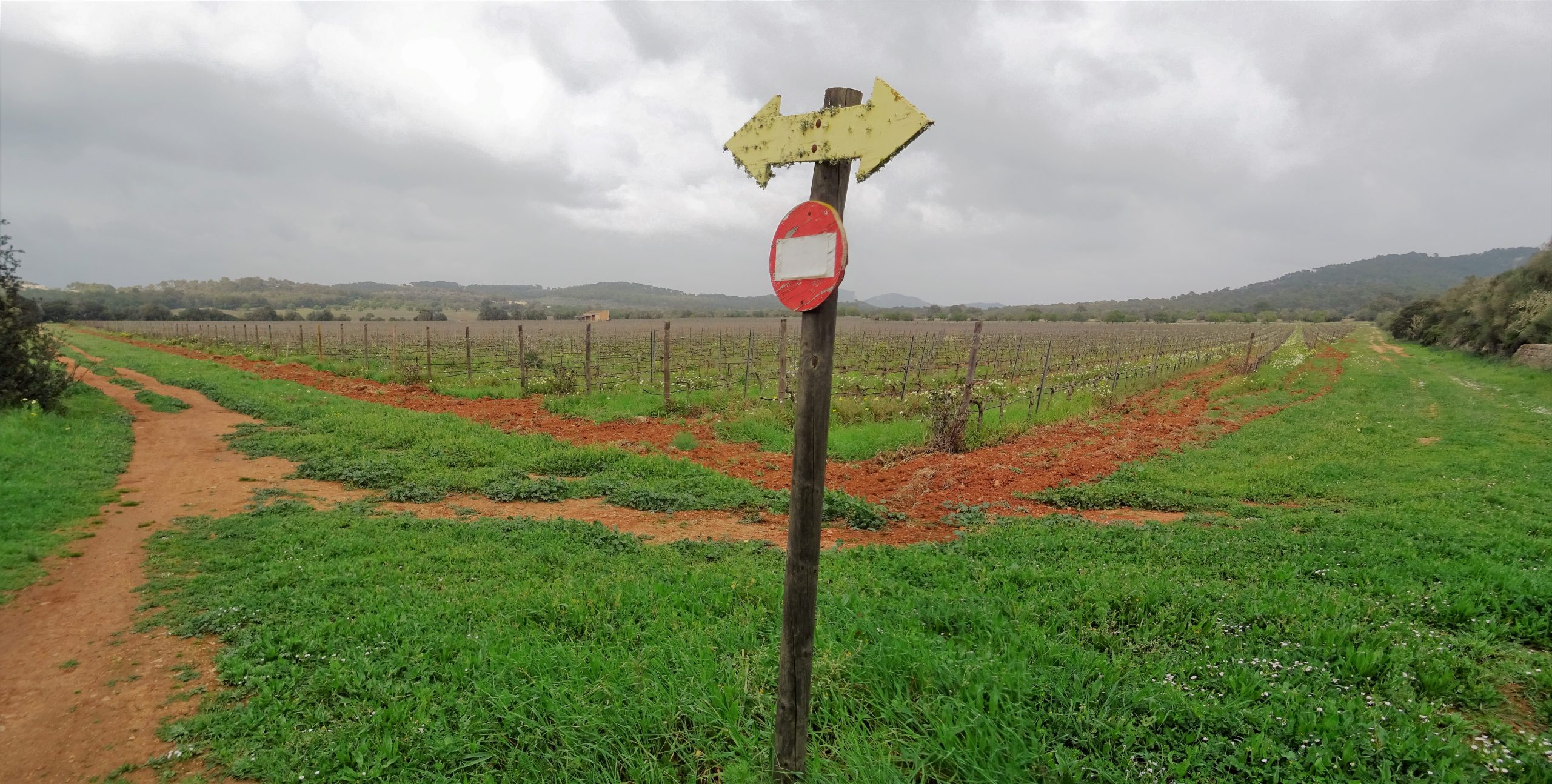 Ara ens queden una mica menys d’un quilòmetre caminant per un ample camí. La paret de la dreta és la partió entre Felanitx i Manacor. Les cases de Son Ventura donen l’esquena a la vinya, encarant la muntanya de Sant Salvador, omnipresent a partir d’ara. Un petit pont de fusta ens facilitarà passar d’una rota a la següent, per continuar amb l’inacabable paisatge de les vinyes alineades. L’única diferencia és que aquí les fileres van d’est a oest i a l’anterior de nord a sud. Ai, els misteris dela viticultura!