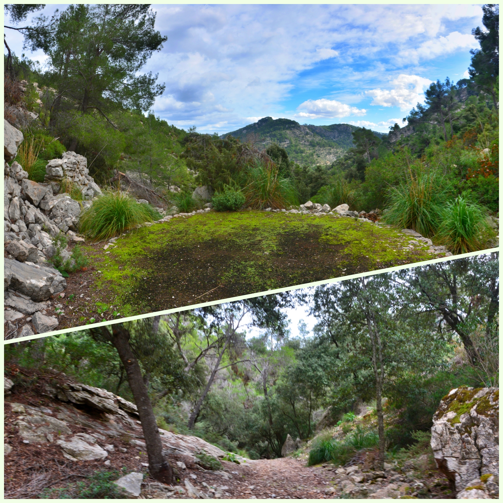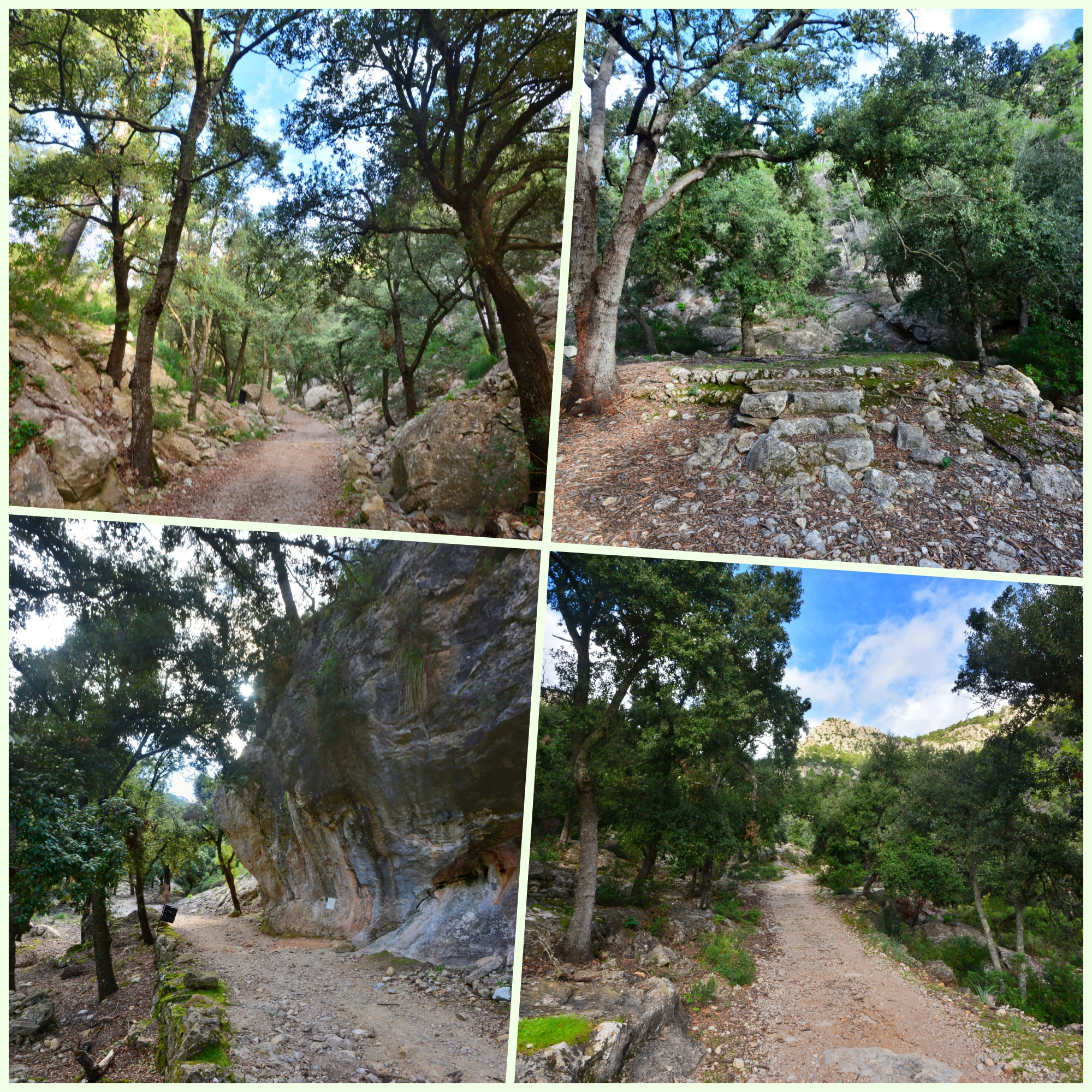 La pista s’interna en el bosc en direcció cap a l’inici de la pujada del Pas de N’Arbona. Arribat a un revolt a esquerres veurem les primeres fites que s’enfilen cap a aquesta comunicació natural amb la Vall de Massanella. Les hem d’ignorar i continuar per la pista que, a poc més de dos-cents metres, s’esvaeix en un ample redol amb restes d’arrasades construccions. A la nostra esquena les puntes del Puig Caragoli des Guix. En diagonal dreta veurem un tirany que s’interna en l’alzinar i inicia un recorregut que enllaça ranxos de carboners i restes de barraques. A estones haurem de gestionar pendents notables al mateix temps que evitem arbres i rabasses caigudes enmig de la nostra trajectòria. Una sitja amb una balconada impressionant ens servirà com a referència del fet que som en el bon camí i ens permetrà alenar una mica.