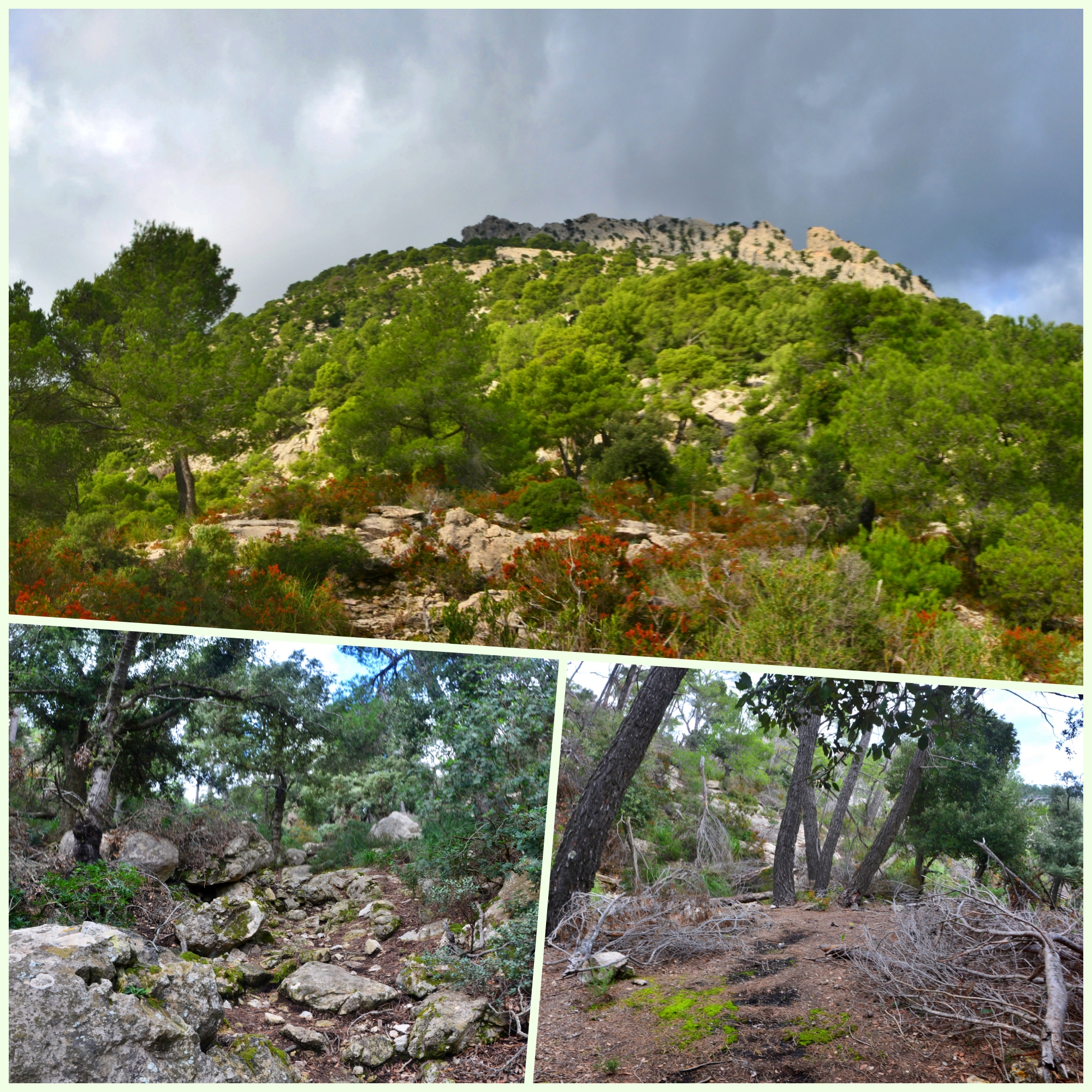 Progressivament ens anirem atracant a una ampla collada. A l’esquerra la barrera de les parets oriental del Puig de N’Alí s’aniran apoderant del paisatge. A l’ample comellar tindrem l’oportunitat de localitzar un petit monòlit que serveix com a punt de demarcació. Des d’una espaiosa sitja un mica més enfora, agafem en direcció cap a llevant per assolir el punt més alt del recorregut. Ens internem per un bosc prim de pins que esdevé ben aviat garriga de xiprell i romaní. El cim està ocupat un conjunt rocós amb un l’esquelet d’un pi mort al damunt. Disposem també d’una vista sobre la Badia d’Alcúdia tancada pel distant Cap Farrutx. Atalaiant sobre el Pla, destaca el Puig de Santa Magdalena i els seus dos pujols bessons. Les Serres de Llevant i el característic Puig de Sant Salvador es retallen en la llunyania. Més a veïnat la Serra des Vidre i el Puig des Barracar tanquen per l’est. La Serra de Darrera mostra la seva cresta a la dreta.
