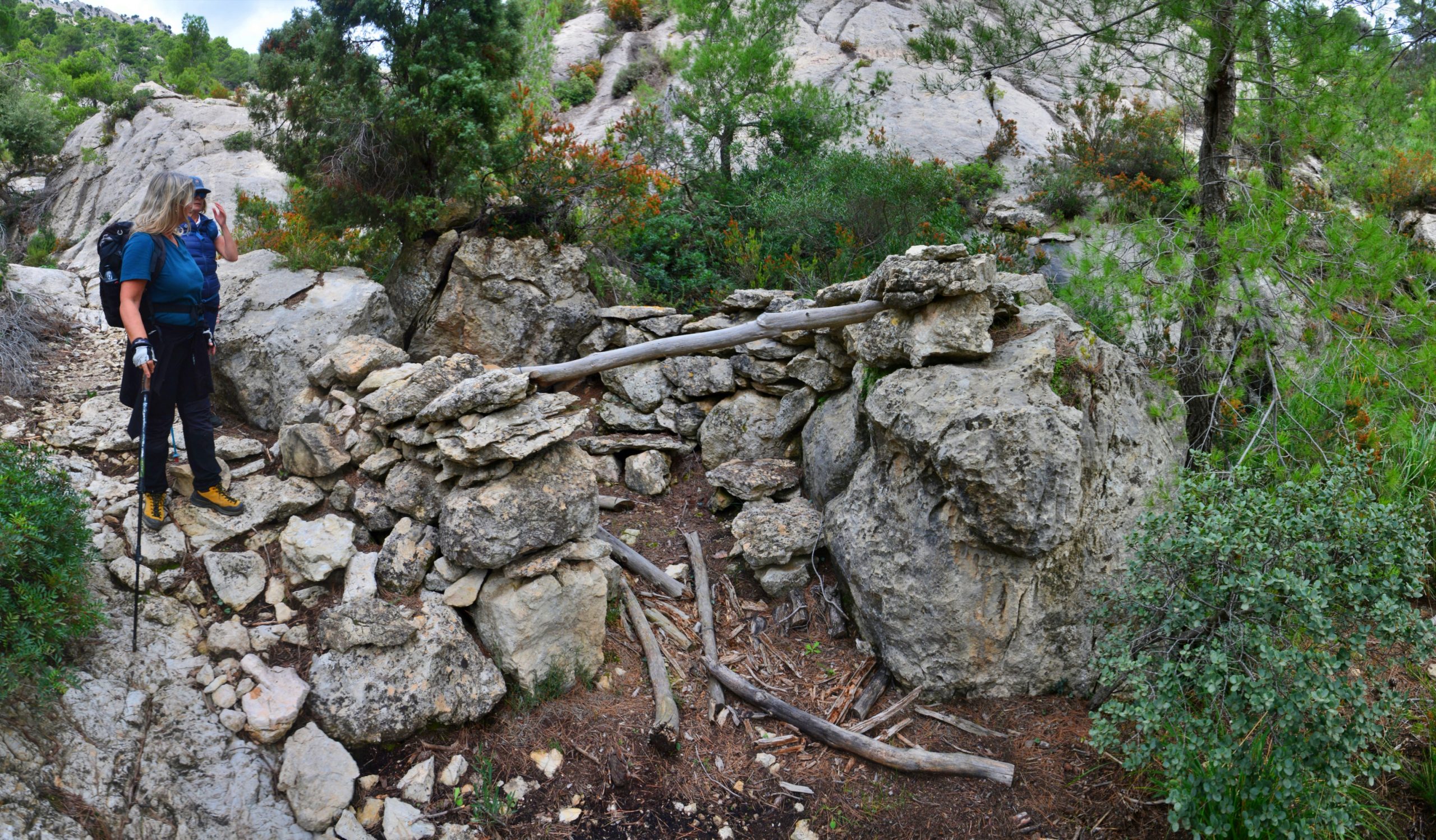 Reprenem la caminada dirigint-nos a l’ull del pont sobre el qual discorr la carretera de Lluc. Agafem el camí que surt a l’esquerra i que s’endinsa en el cor de les muntanyes que amaguen Lluc i la seva vall. El Torrent de Sa Coveta Negra es converteix en el nostre company. La presència de restes de l’activitat de transformació de la llenya en carbó vegetal són constants i variades. Al costat dret apareix una sitja amb doble garlanda i una escaleta de pedra per facilitar la feina. Més enllà topem amb uns penya-segats amb una placa que rememora un luctuós fet als anys vuitanta del segle passat just davant d’un extens ranxo amb barraques i sitges. Si ens internéssim dins la garriga que s’estén a l’esquerra aviat trobaríem l’anomenat com a Avenc des Cans.