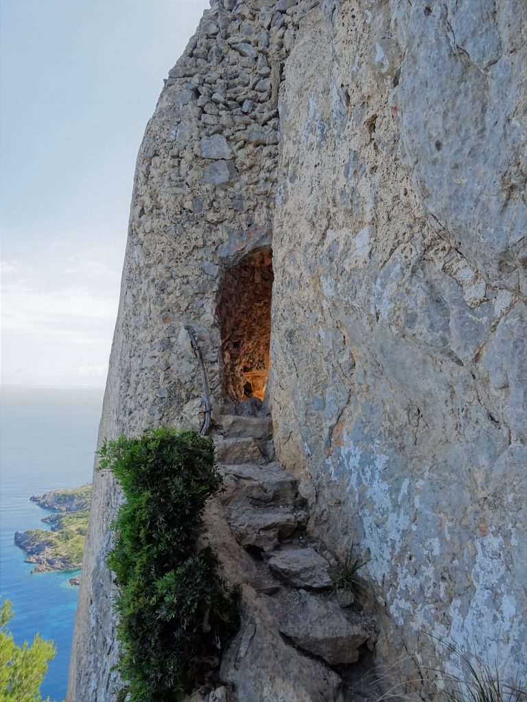 A l’altre costat de l’entrada hi ha un estret sender bastit sobre marges equipat amb una sòlida cadena que ens fa de passamans i assegurarà les nostres passes fins que arribem a un conjunt de construccions agrupades en un petit replà. L’excepcional visió de Cap Pinar i les seves aigües no ens ha de fer perdre pas.
