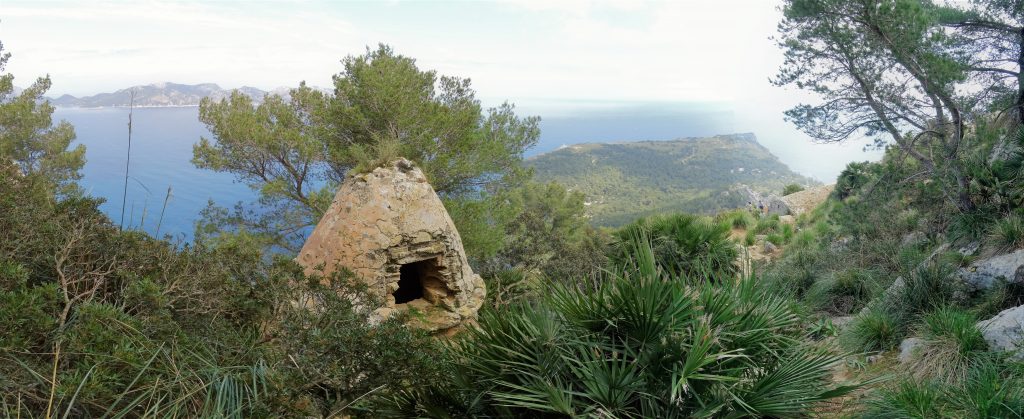 Aquesta bretxa ens dóna pas a un caminoi que connecta amb la via que hem abandonat per anar a cercar el coll des Jueus. Girem cap a la dreta i anem caminant amb la mar de la Badia de Pollença als nostres peus. Després de superar unes polides lloses de roca arribem a una baixada curta que ja mostra Cap Pinar i que ens deixa als peus d’una peculiar construcció.