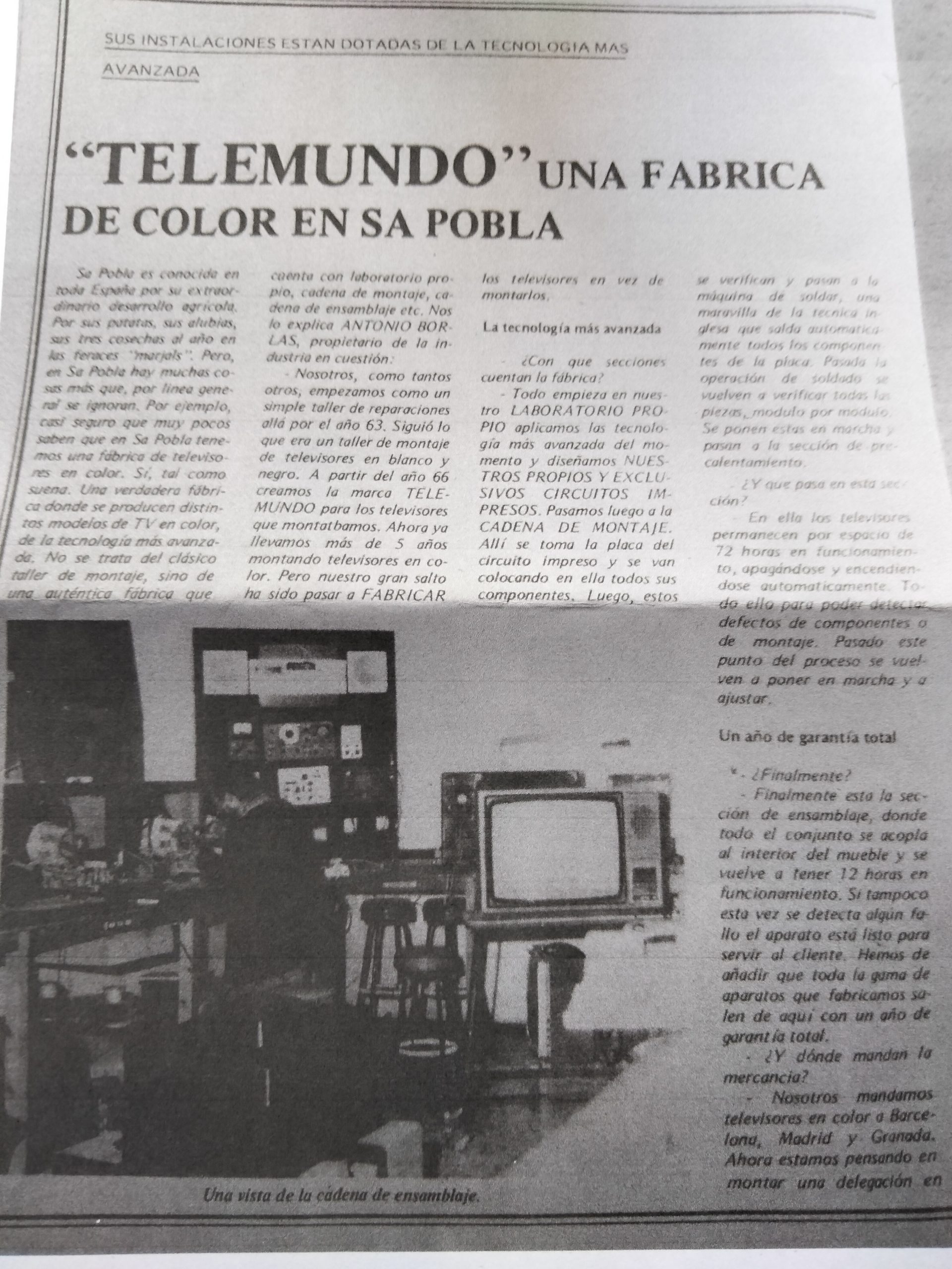 Finalment, es passava a la secció d’assemblatge, acoblant tot el conjunt dins el moble i es tornava a tenir 12 hores en funcionament. Si no es detectava cap incidència, l’aparell estava llest per arribar al comprador. Tota la gamma d’aparells fabricats per Tele Mundo, s’entregaven amb un any de total garantia. Aquells televisors, fabricats íntegrament a sa Pobla, es distribuïen per tot Mallorca i també a altres punts de la península com Barcelona, Madrid i Granada.