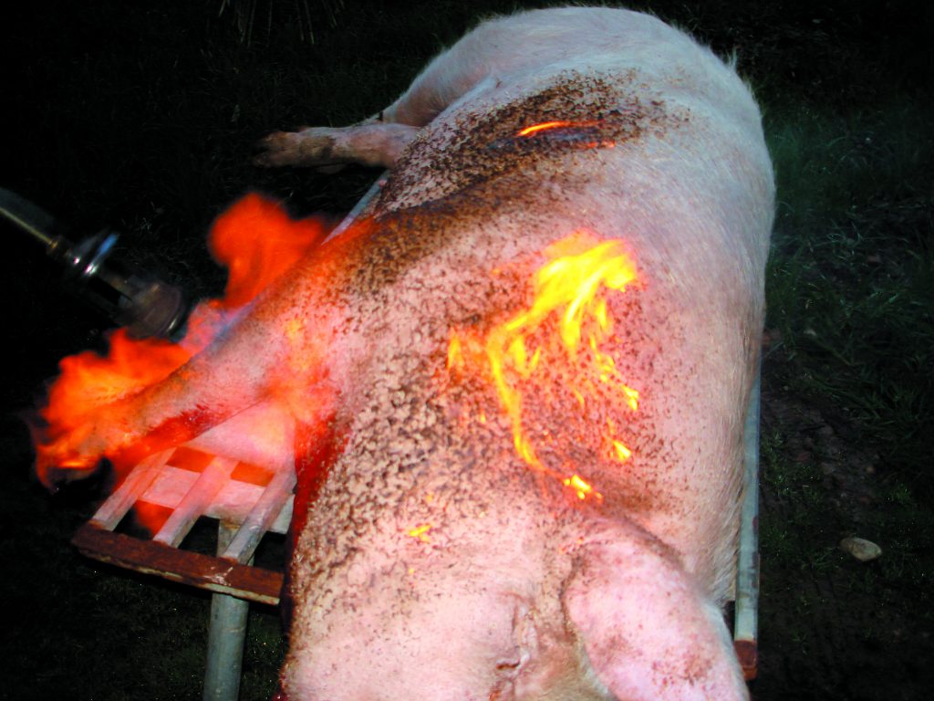 El pas següent és socarrar la pell de l’animal amb un bufador (antigament es feia amb aritja seca) i reblanir-la fregant-la primer amb ganivets, i posteriorment amb pedra tosca i aigua calenta, fins a deixar-la ben neta.