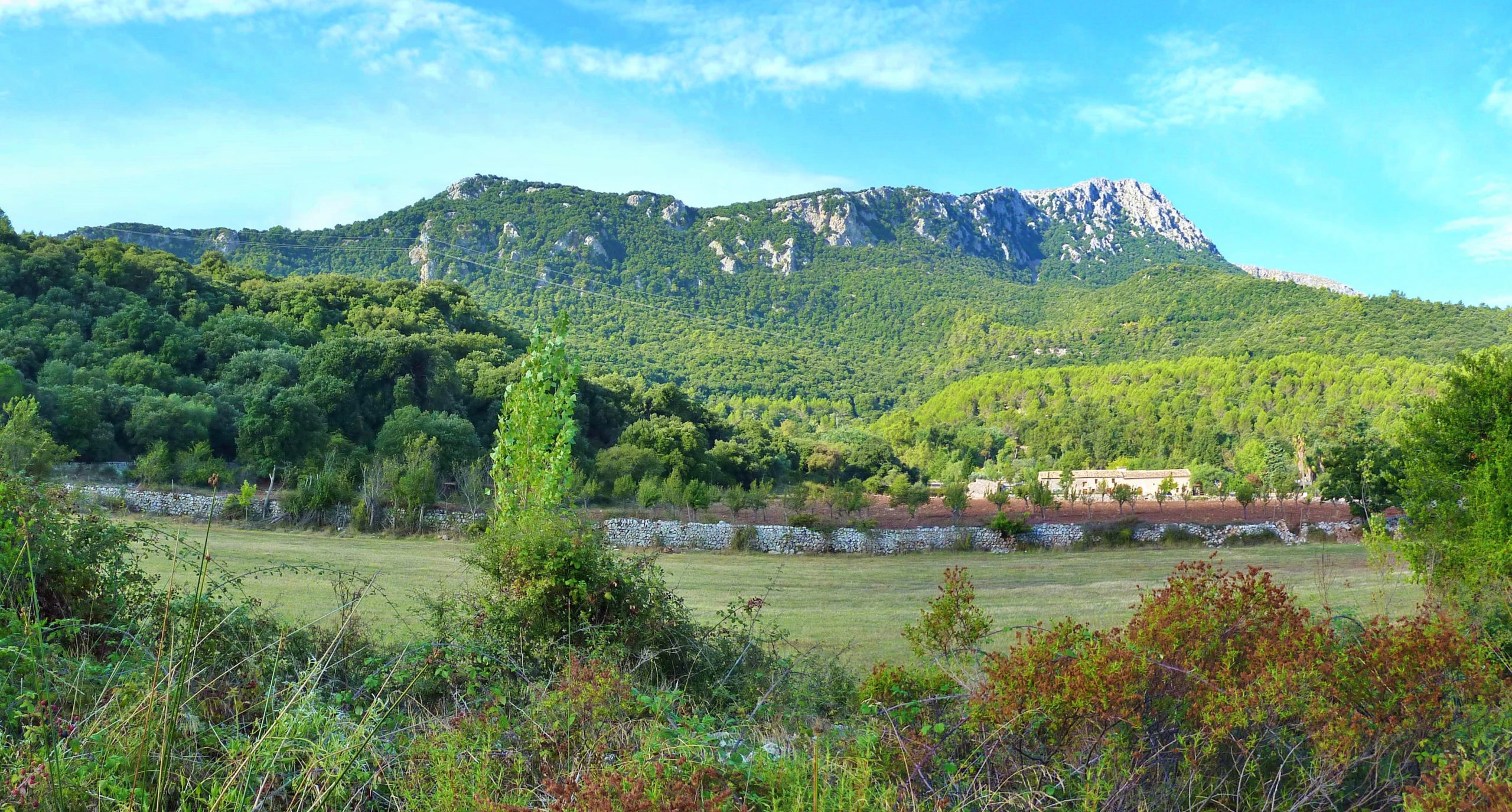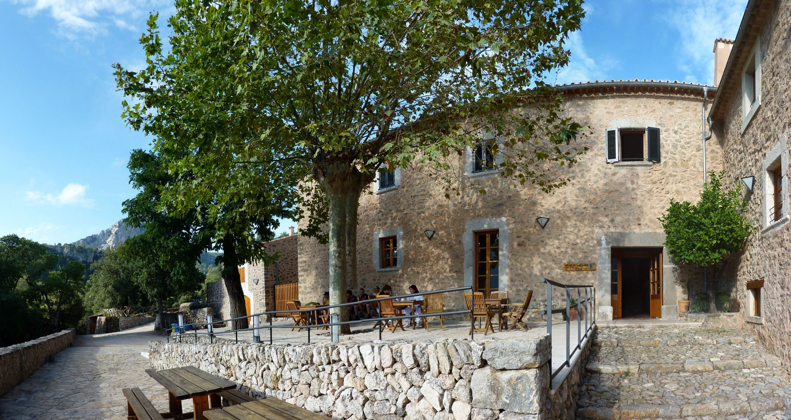Desemboquem en els jardinets de la part exterior del refugi. Al costat nord veiem un ample mirador. La vista abasta des del Puig Roig fins al Caragoler de Femenia. El monestir i el mirador del Camell es poden ubicar amb facilitar enmig d’unes extenses formacions boscoses. La serenor que transmet la contemplació d’aquest bell paisatge natural premiarà l’esforç.