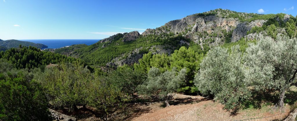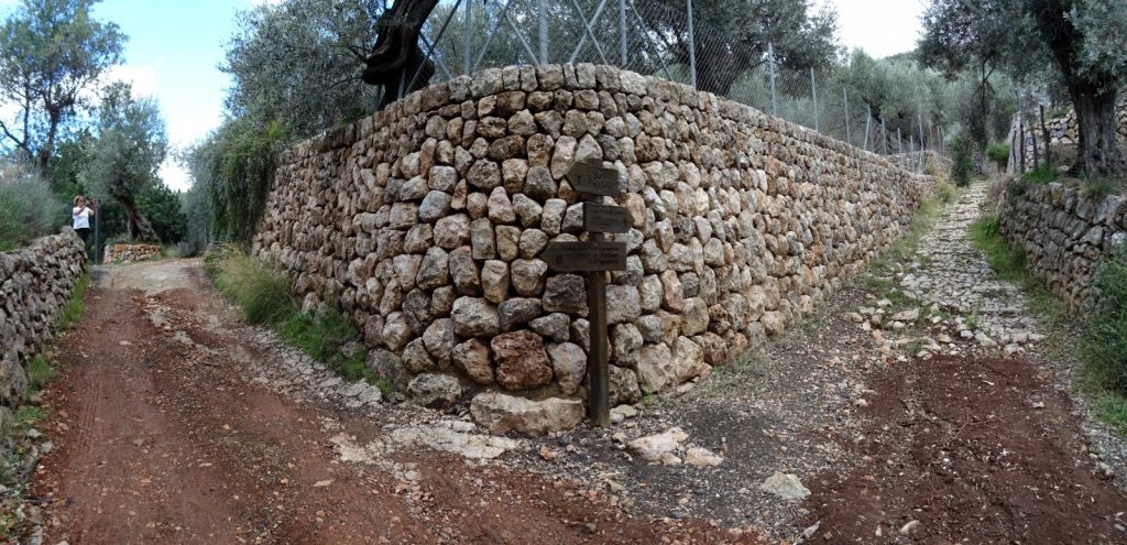 Ara tenim a la nostra dreta la vall de Sóller amb la murada de la Serra d’Alfàbia amb la bretxa del Coll separant-la del Teix i es Puig des Vent. Agafem cap a l’esquerra seguint un estret tirany que va guanyant alçada deixant a l’esquena la mar i superant alguns punts complicats amb l’ajut de cables metàl·lics per assegurar-se. Aviat desembocarem a un ample camí que transita en descens enmig d’olivars esplèndids i ben cuidats per al cap d’uns 10 minuts arribar a un altre encreuament de camins amb la indicació Camí Vell de Bàlitx a l’esquerra.