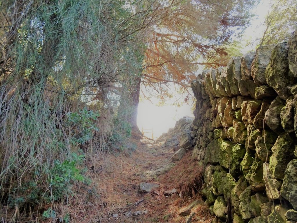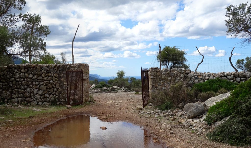 Avui tombarem a la esquerra per seguir la pista passant a veïnat de Son Llampaies i una mica més endavant arribem a un encreuament amb les restes d’una antiga cimentera a on hem de tombar a la dreta seguint un camí que puja per amunt enmig de marjades plenes d’oliveres, un vertader espectacle visual amb els pinars de Es Matar a un costat. Uns pals indicadors ens portaran cap a una collada a on, desprès de superar uns portells, agafarem un camí a la dreta que va guanyant alçada en direcció cap l’est, superant un botador i un parell de barreres, enmig de olivars i amb la carena del Puig de Bàlitx a Tramuntana.